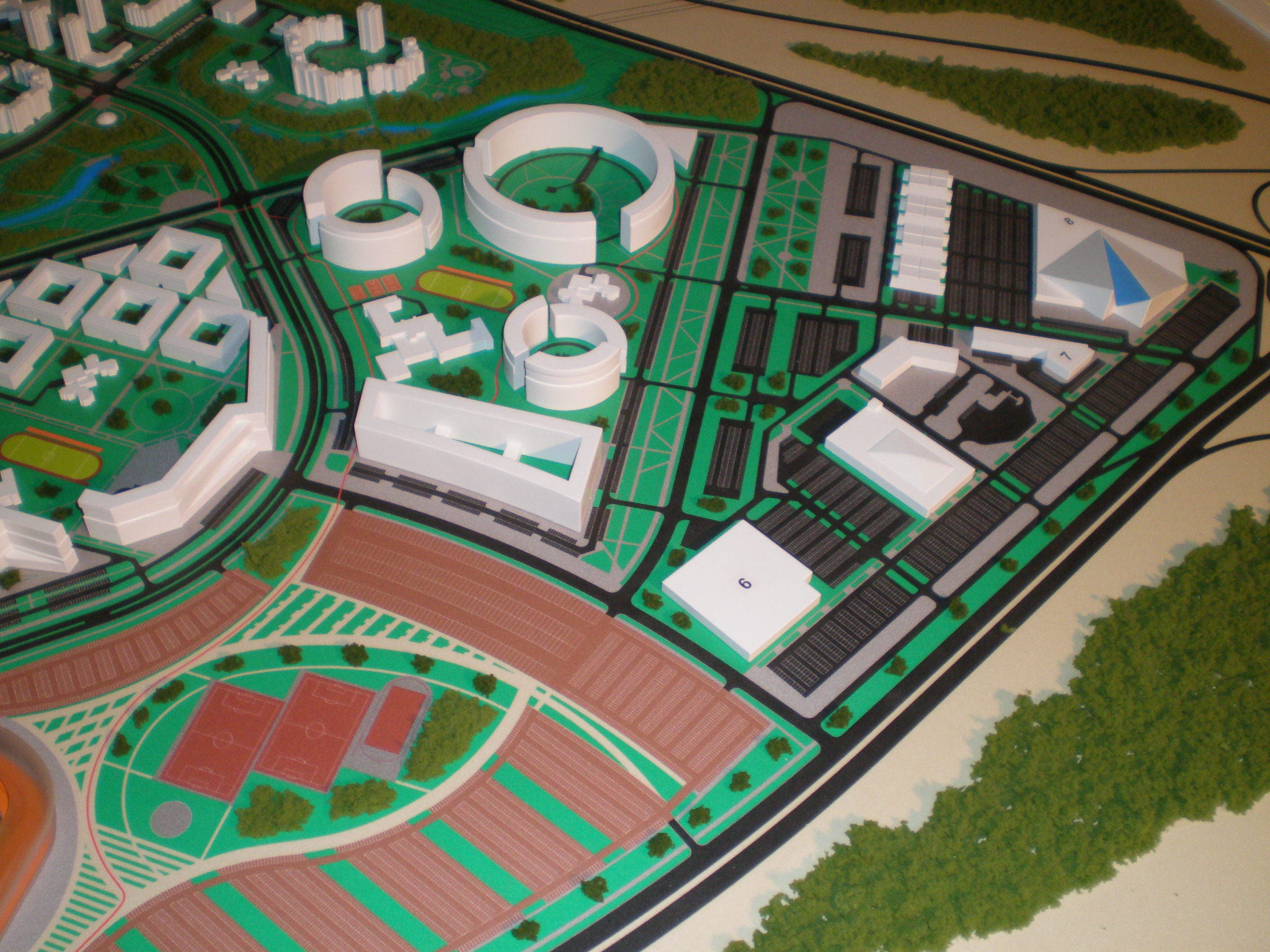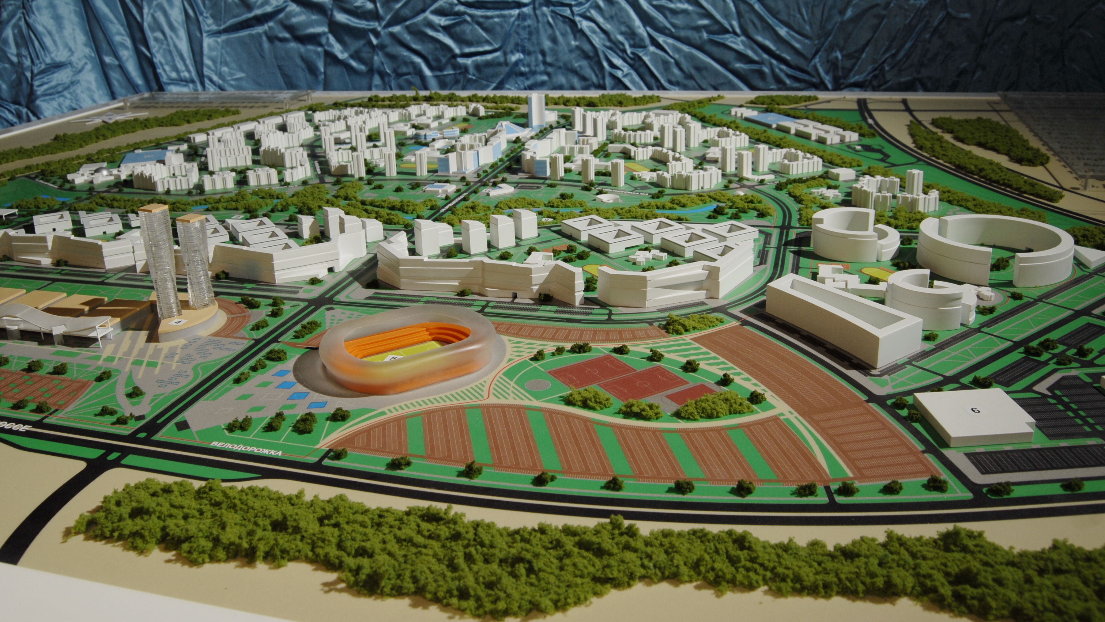 Auf dem Entwurf sieht man einen Wohnbau mit 9 Wohngebieten, eine Waldparkzone, ein Logistikzentrum, einen Hotelkomplex neben dem Internationalen Einkaufse und Ausstellungszentrum, ein Stadium.