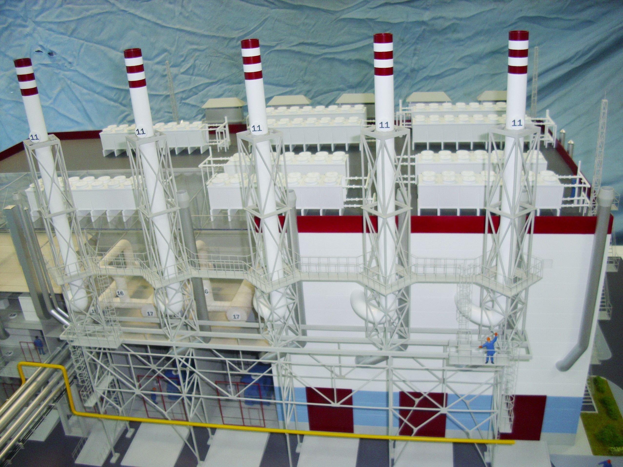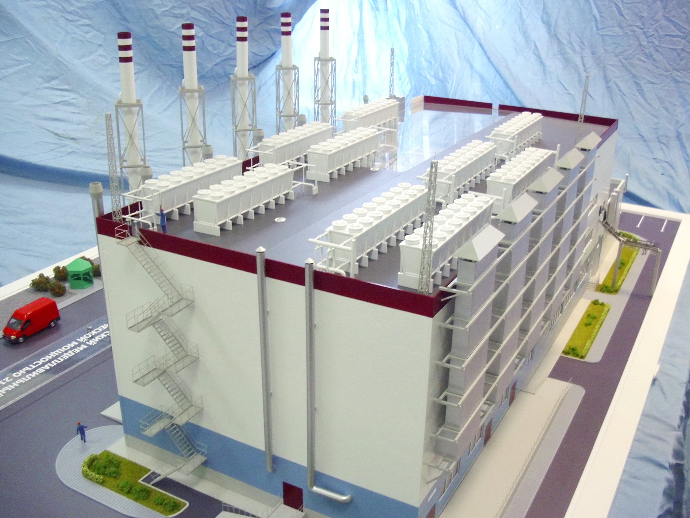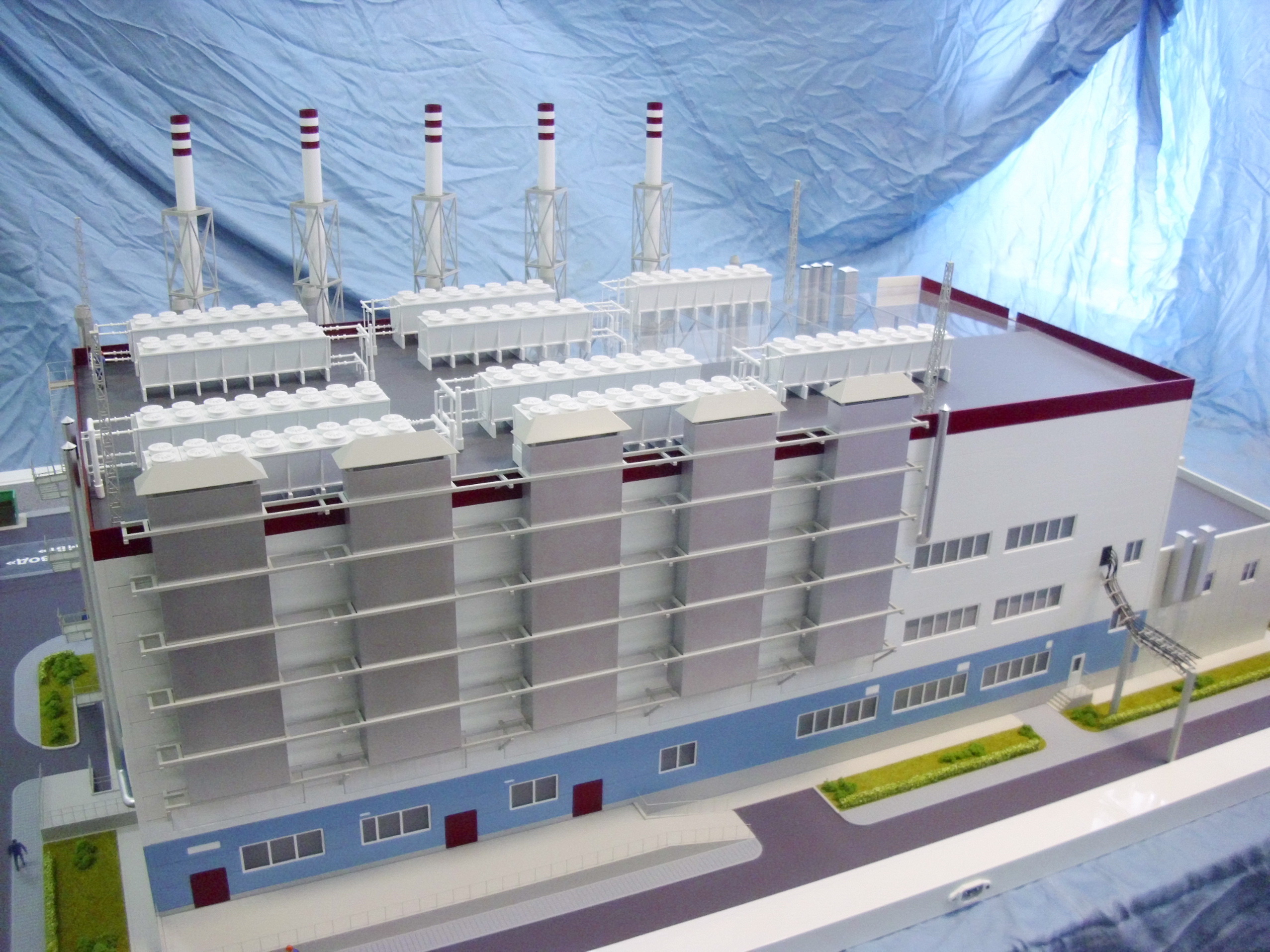 Das Modell des Mini-HKW mit einem Gebäudeabschnitt und der Wiedergabe von der im Gebäude installierten Ausrüstung ist im Maßstab 1 / 50 erstellt.