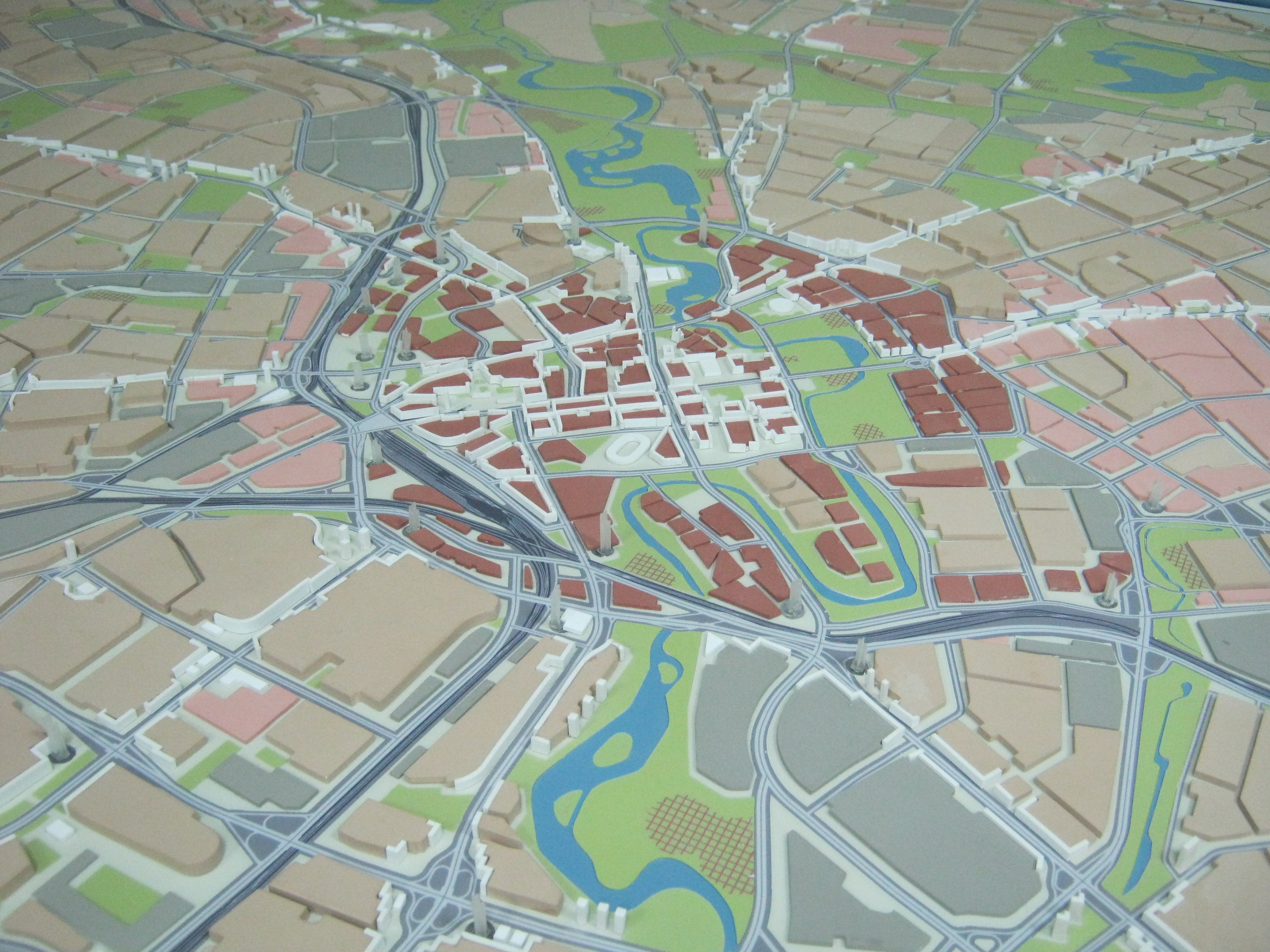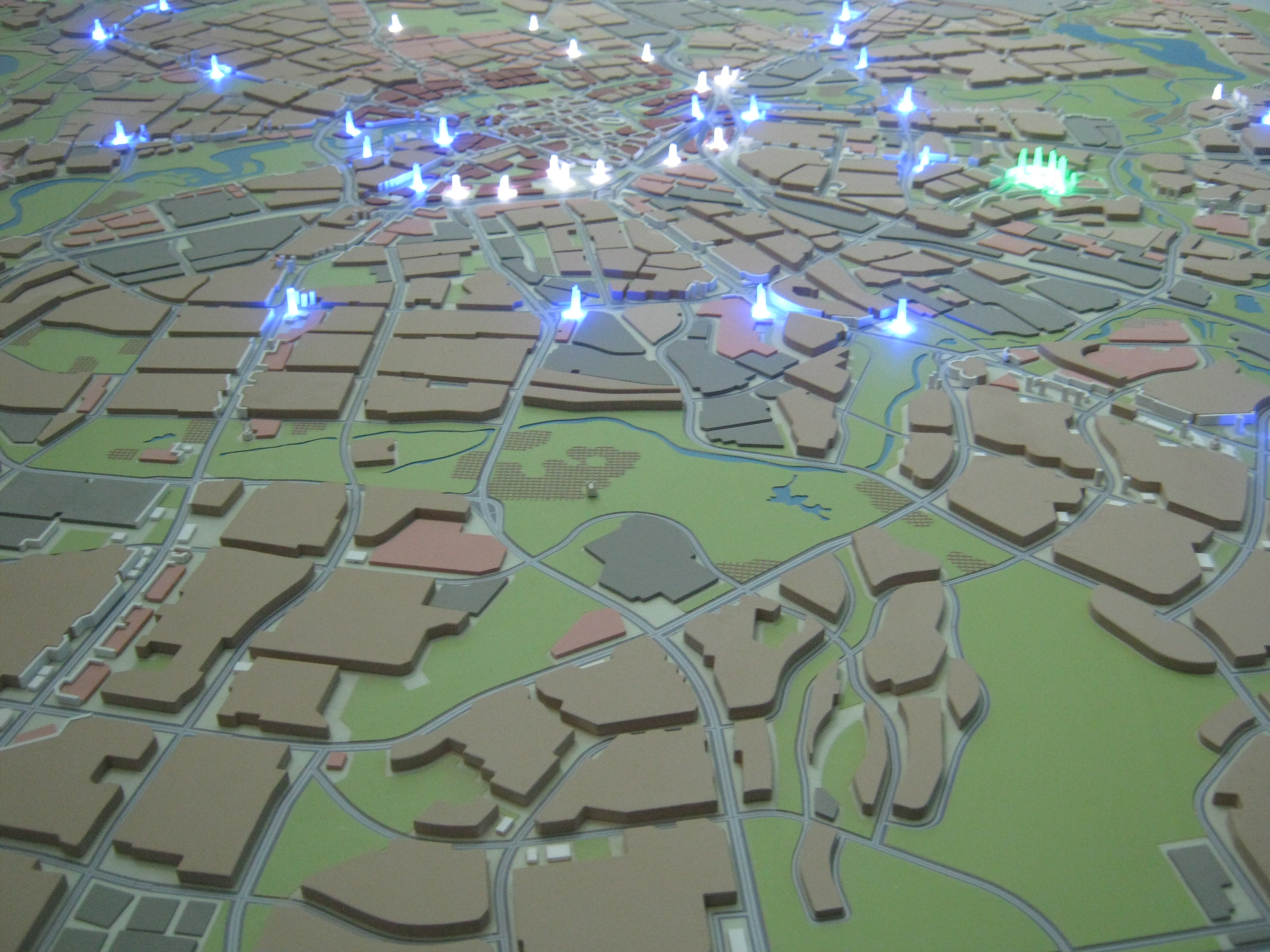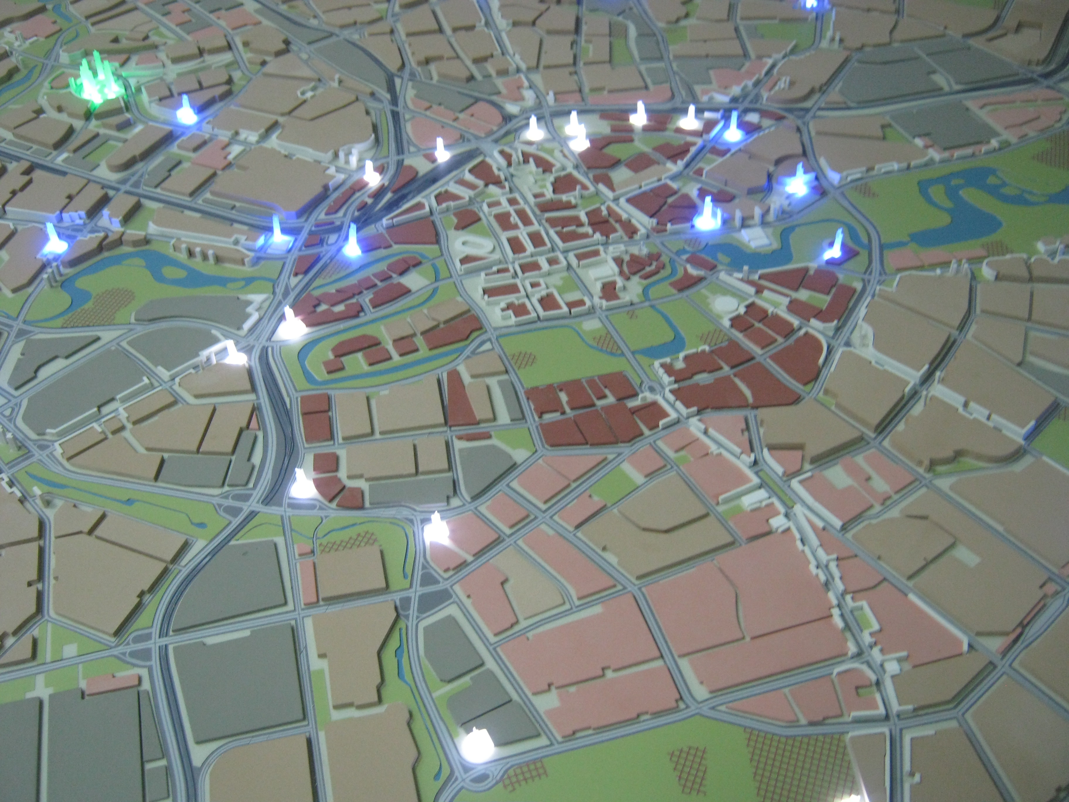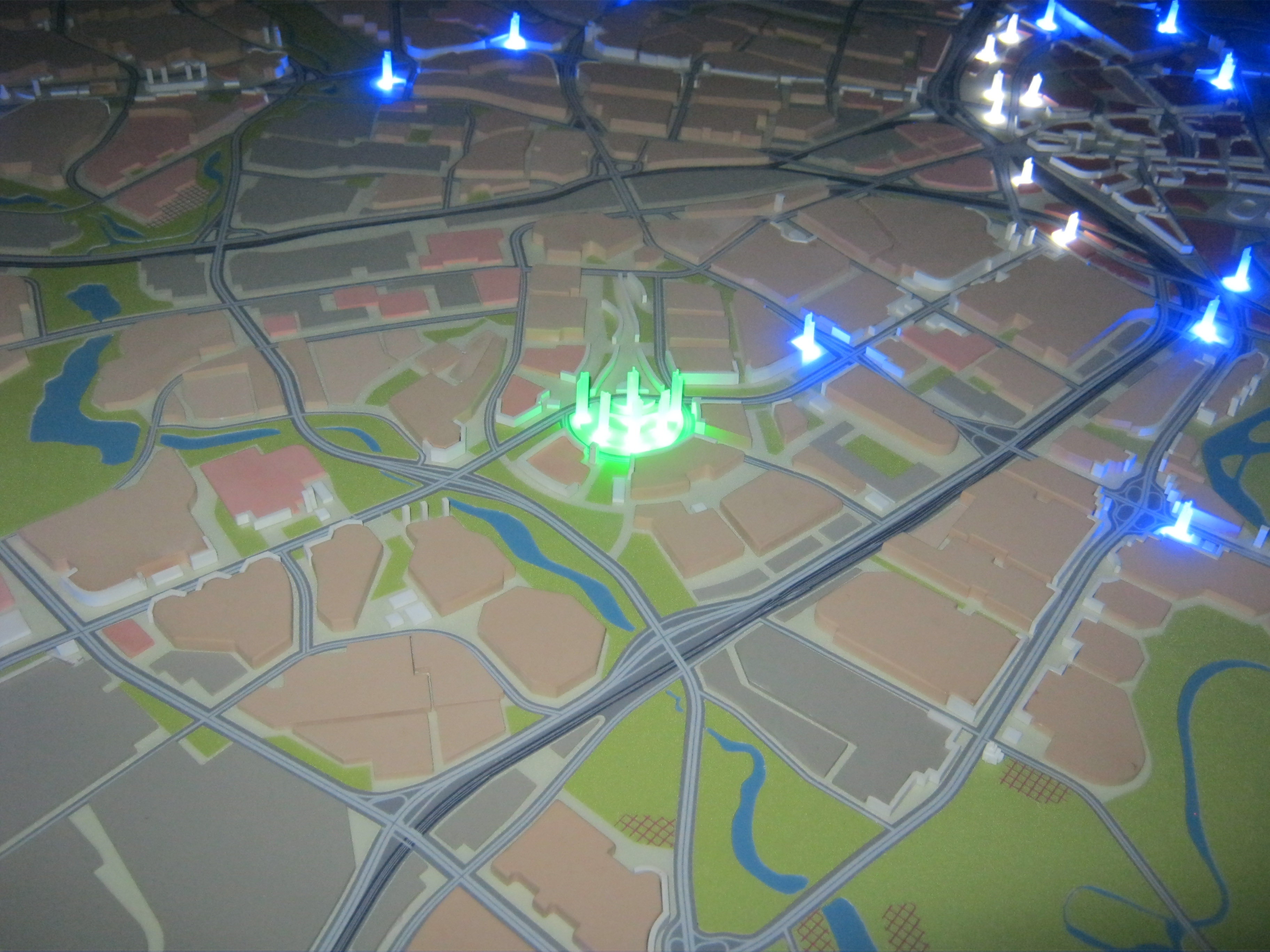 Auf dem Modell sollten alle Hochhäuser gezeigt werden, sowohl vorhandene als auch Standorte für zukünftige Hochhäuser.