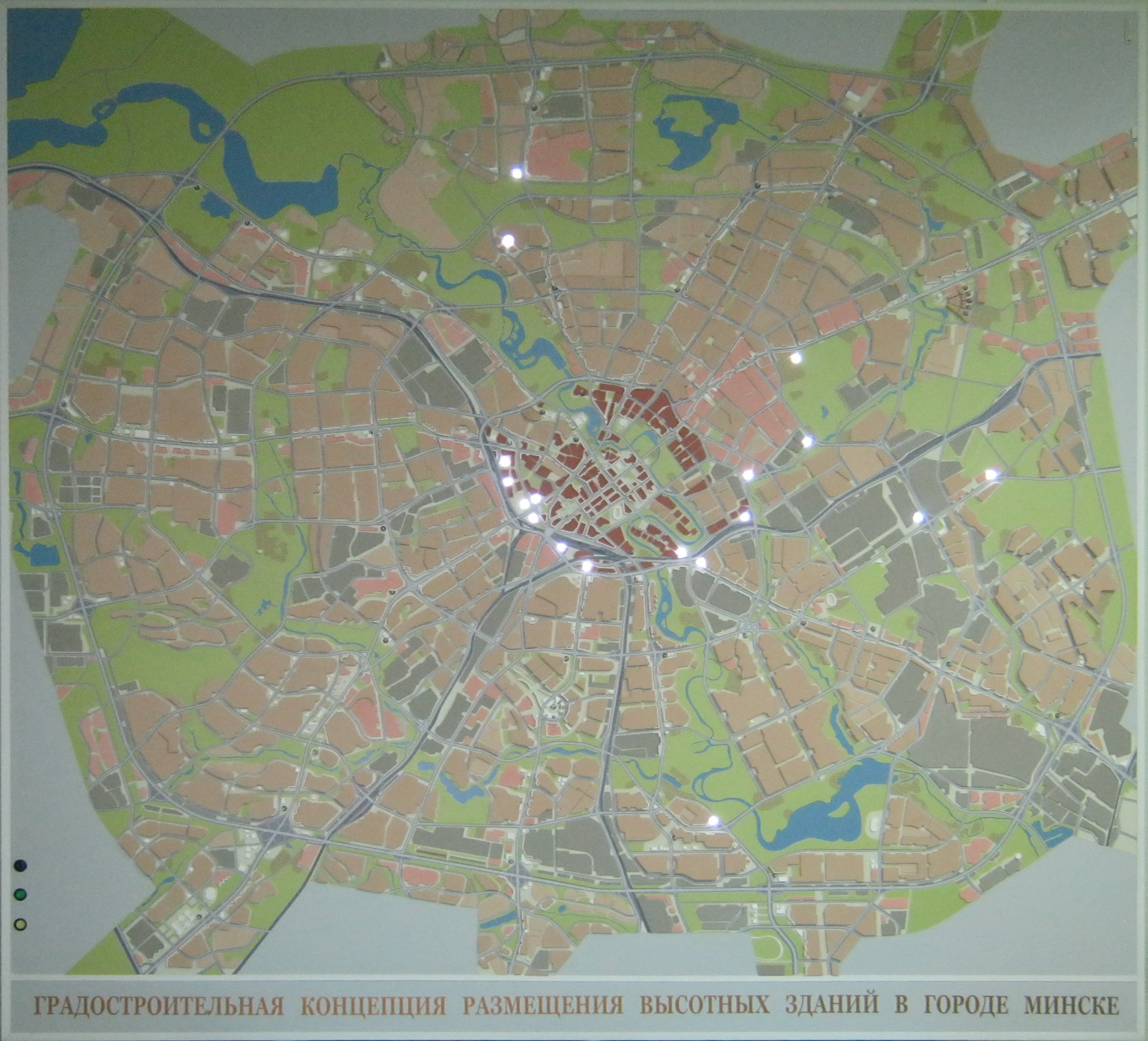 Der 3D-Stadtplan Minsk mit Wiedergabe von wichtigsten Standorten für den Hochhausbau ist im Maßstab 1 / 10000 erstellt.