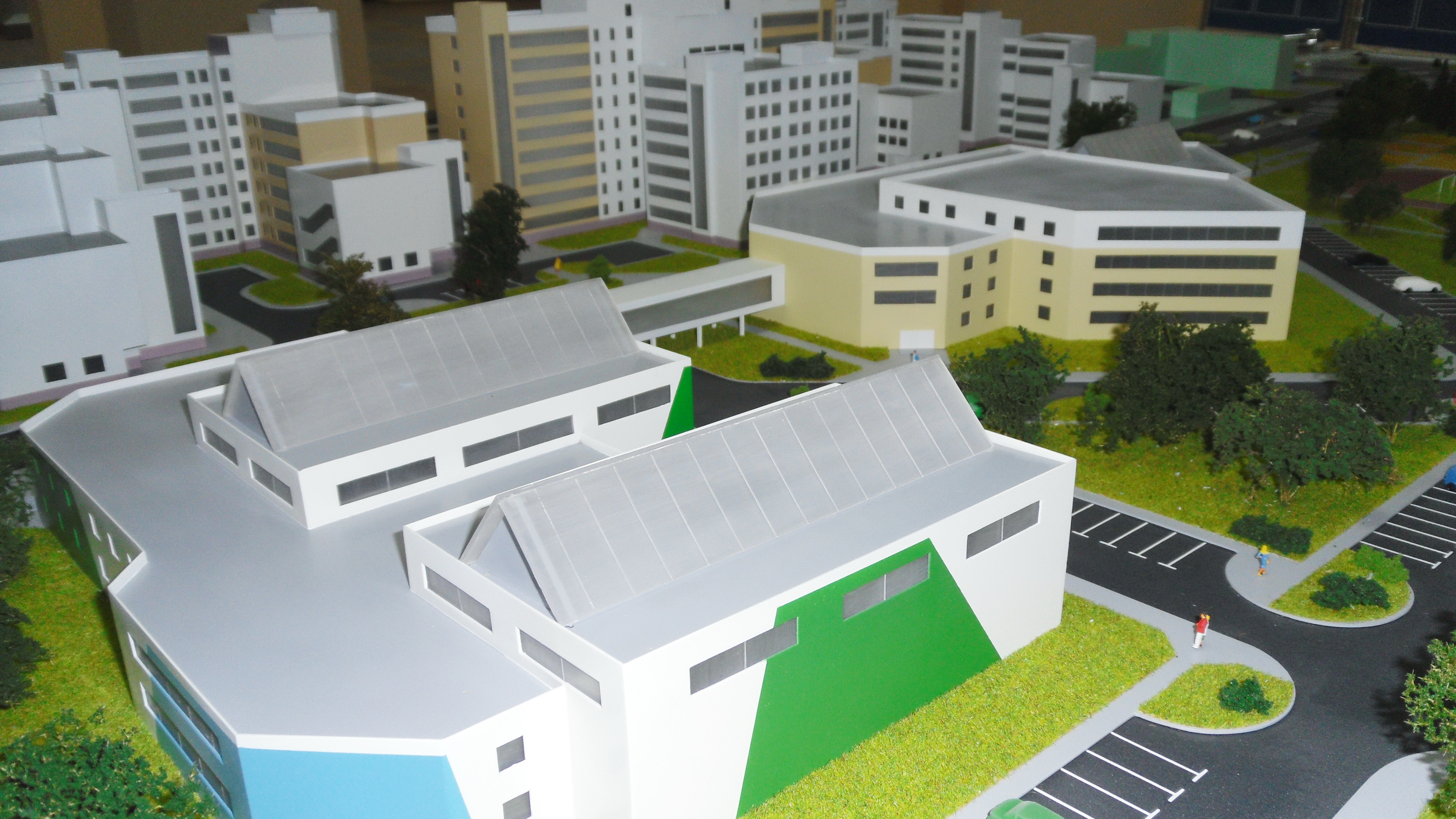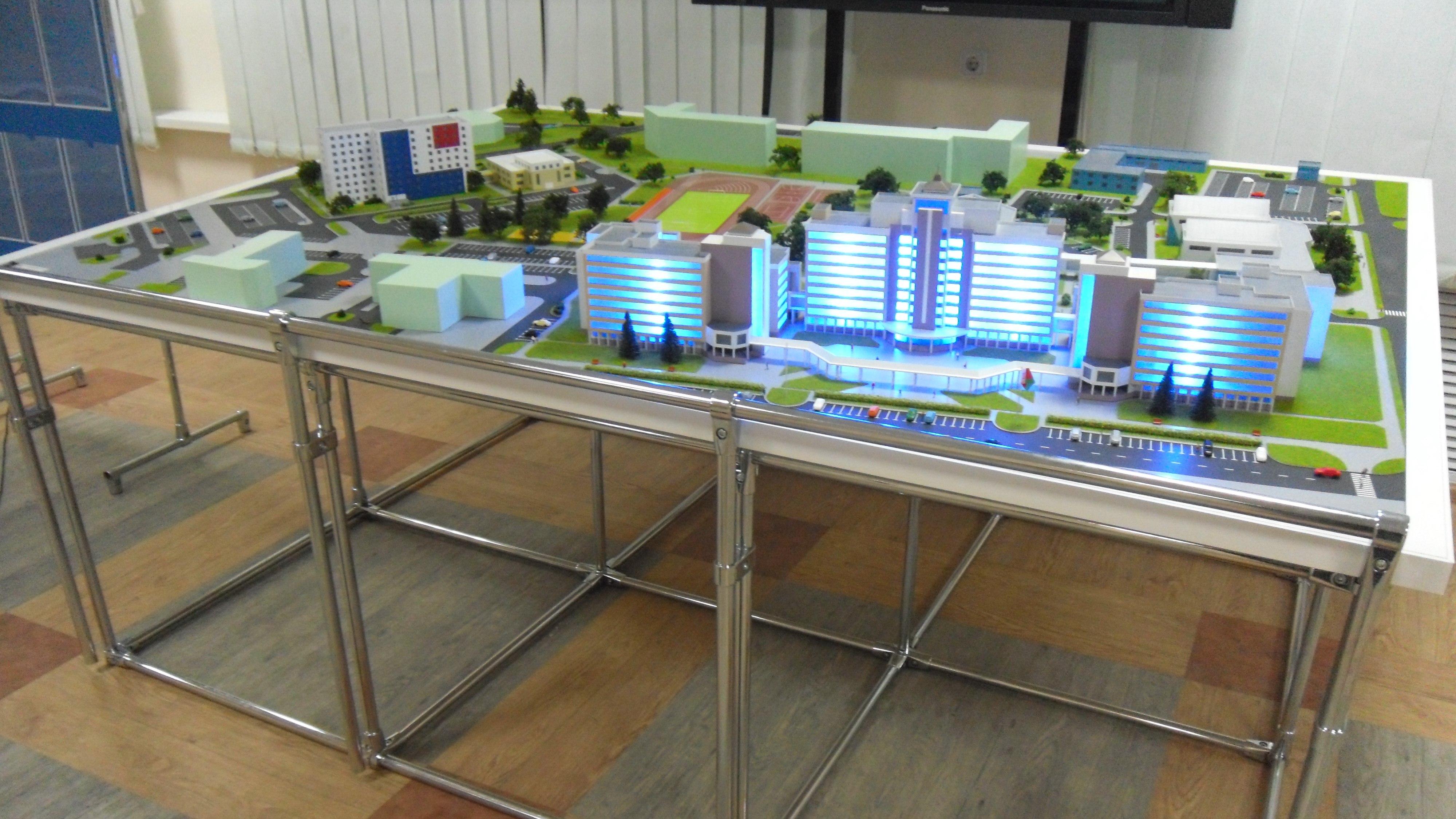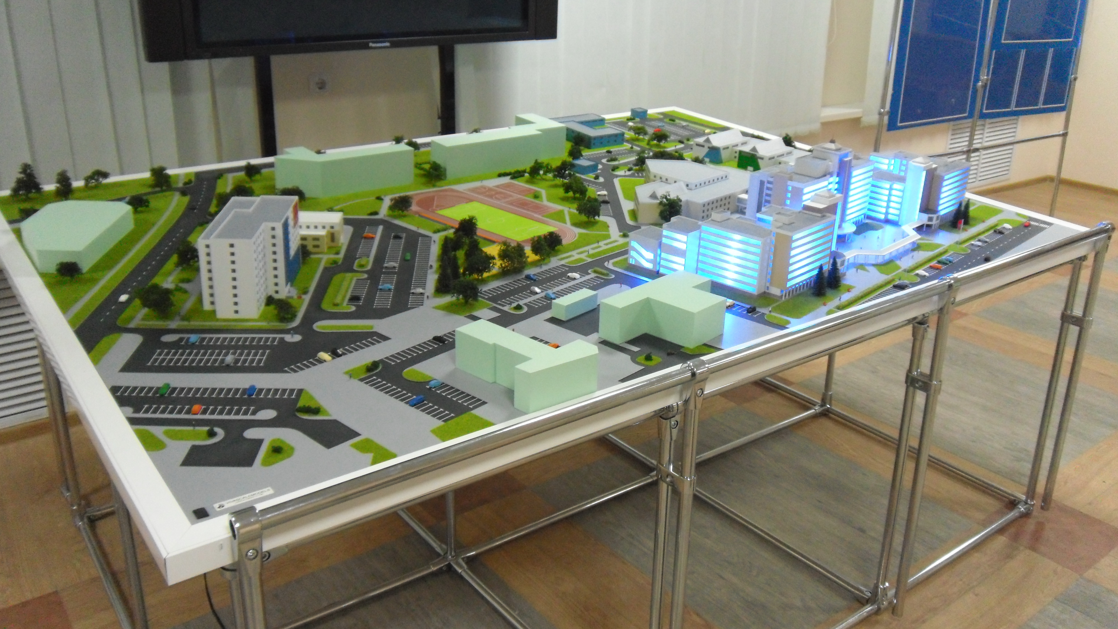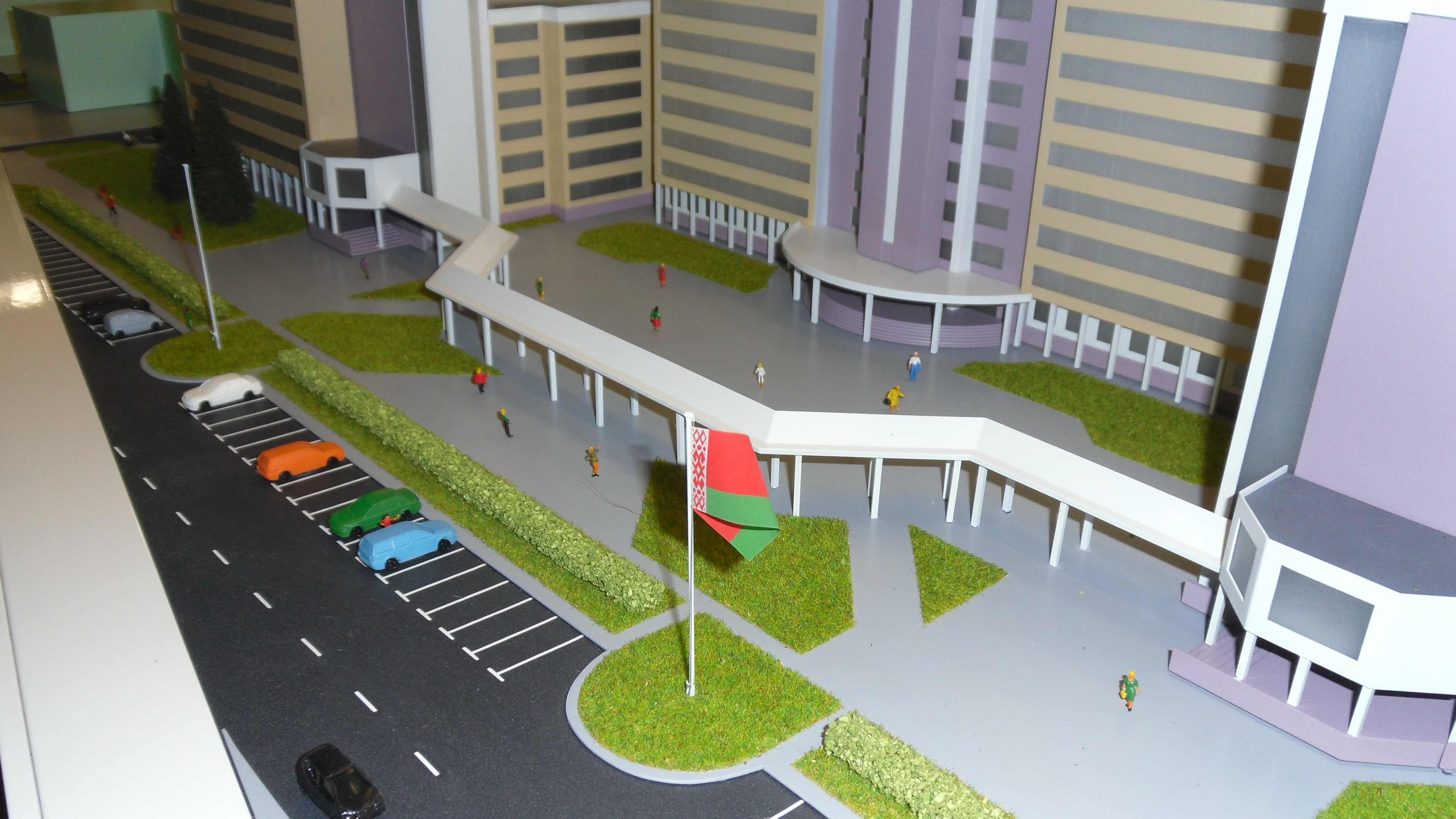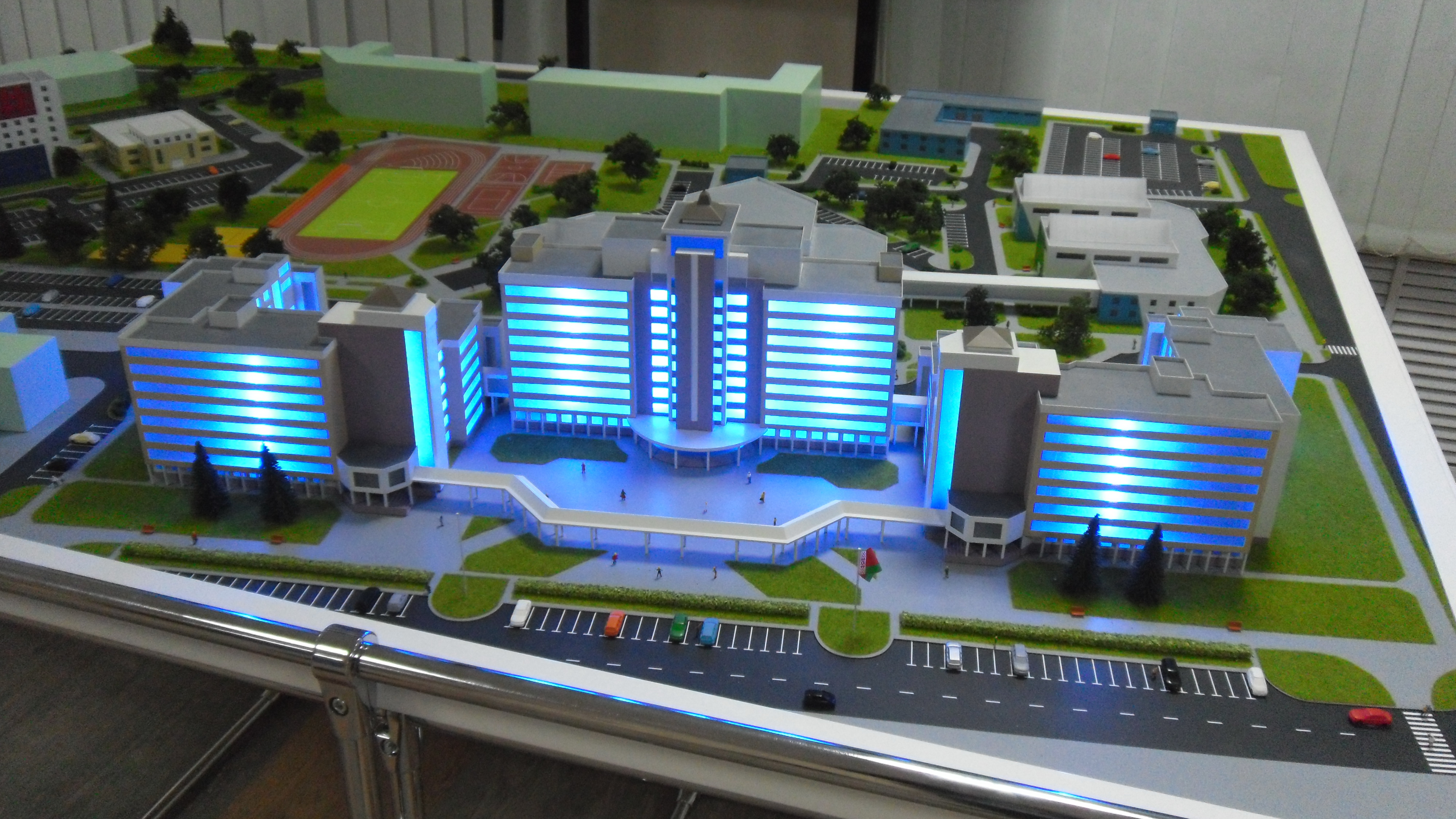 Architekturmodell des Bauvorhabens des Hauptgebäudes und des angrenzenden Territoriums der Yanka Kupala Grodno State University.-