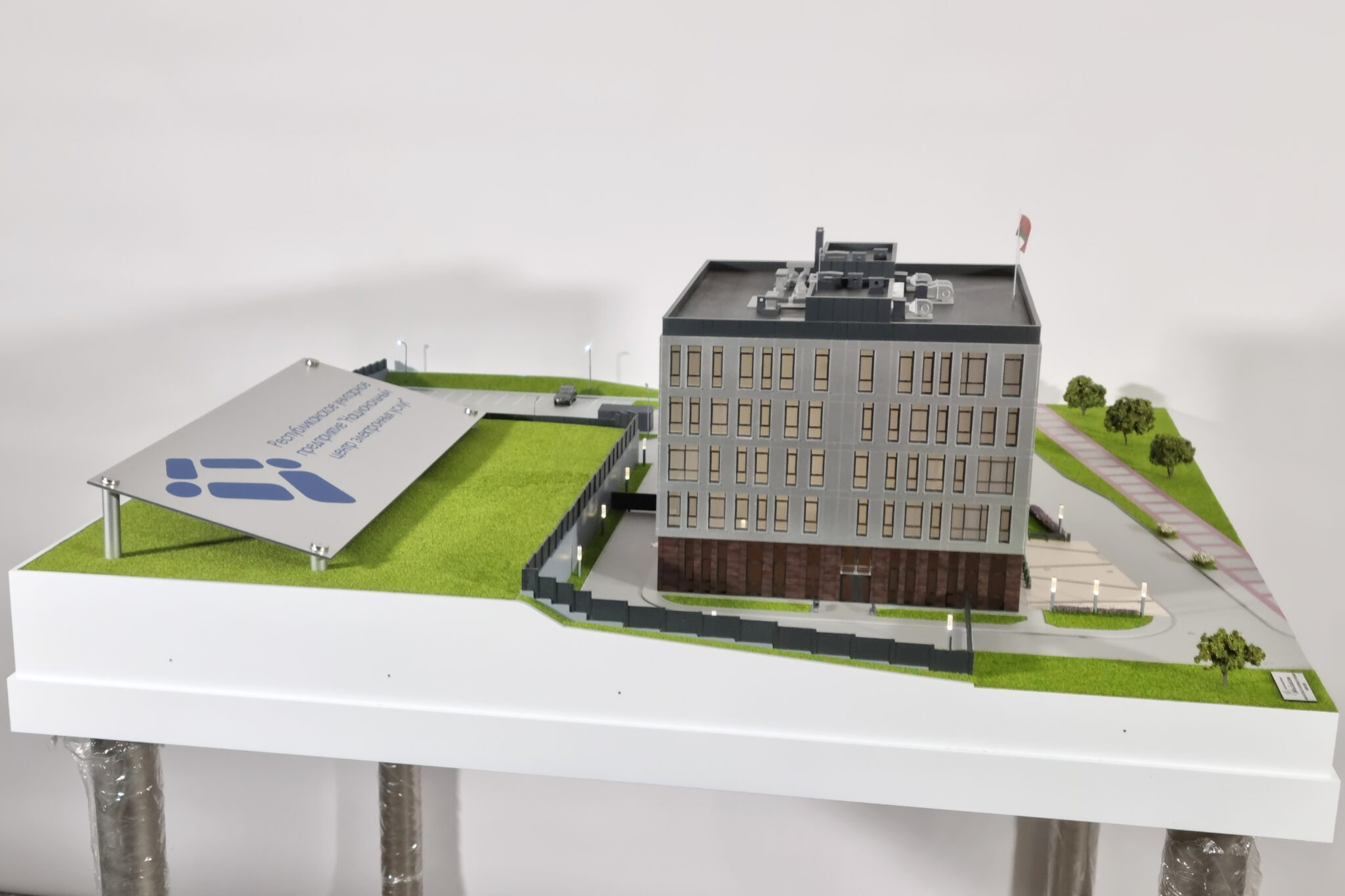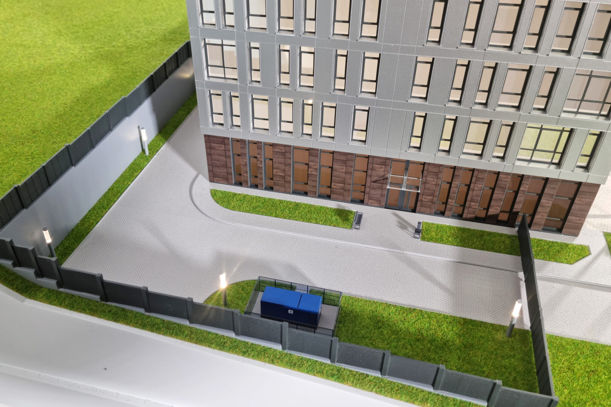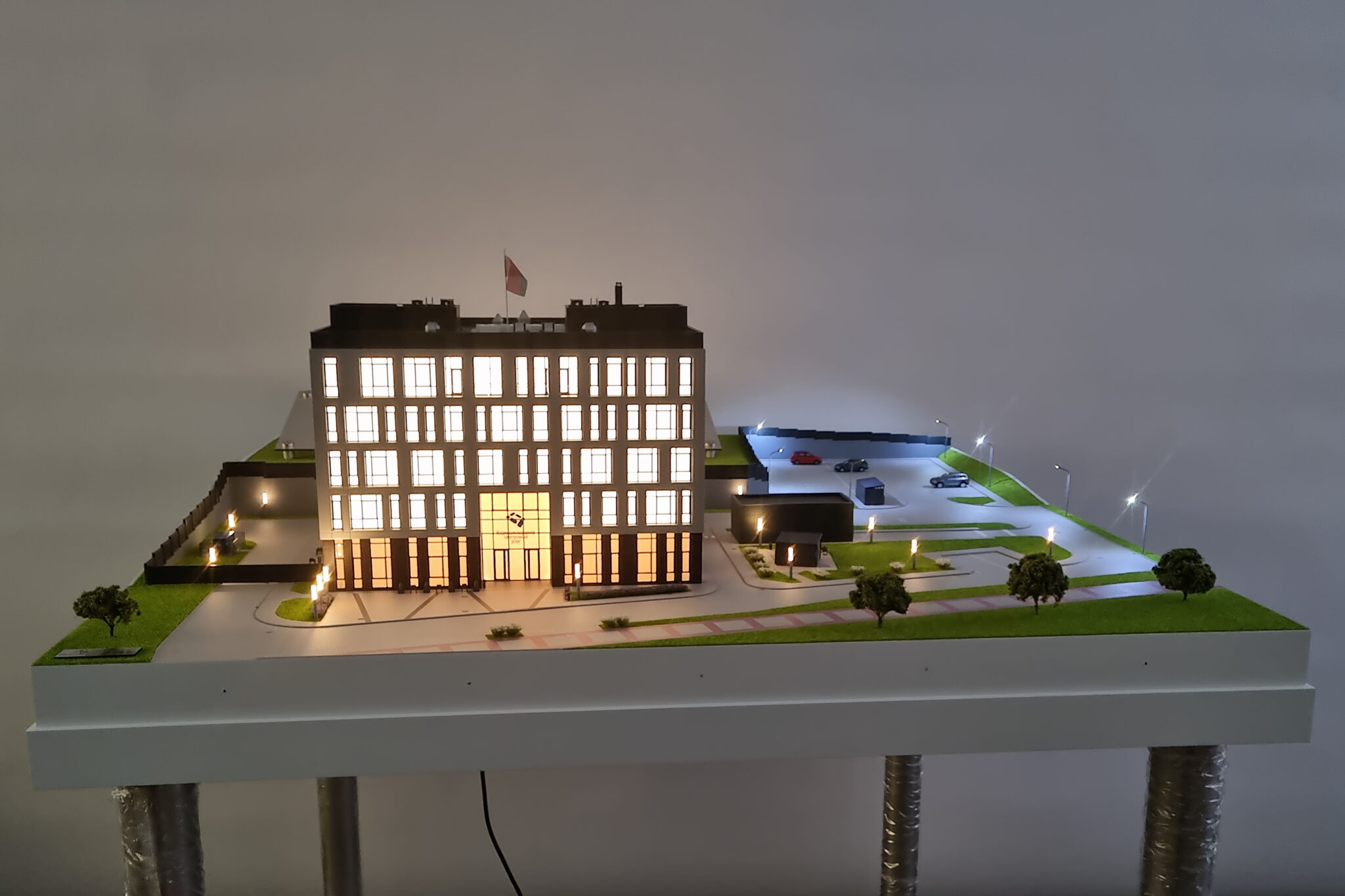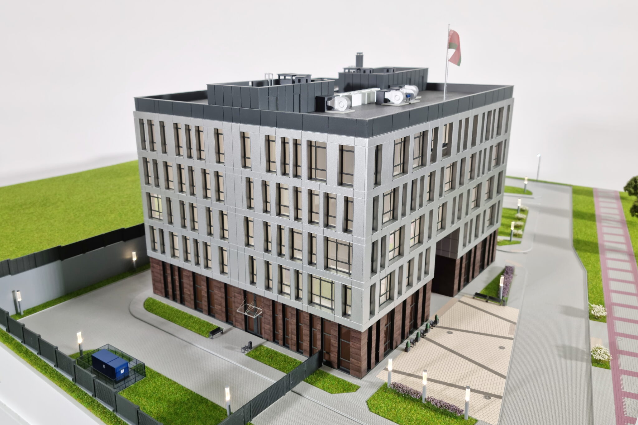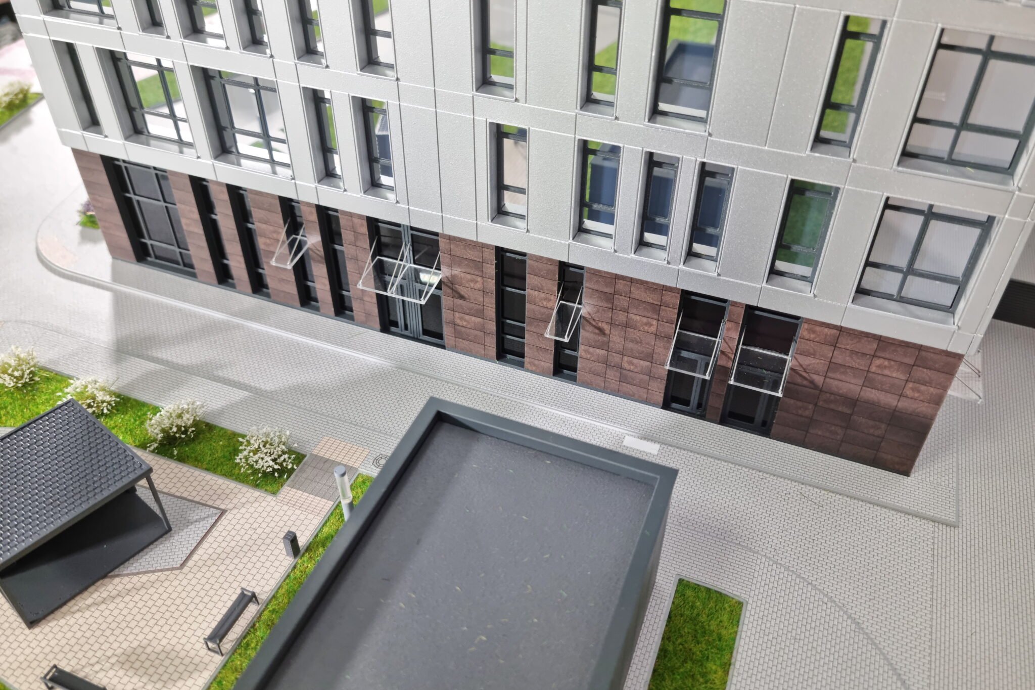 The building is made of plastics of various thicknesses with the application of self-adhesive films and painting of the facades.