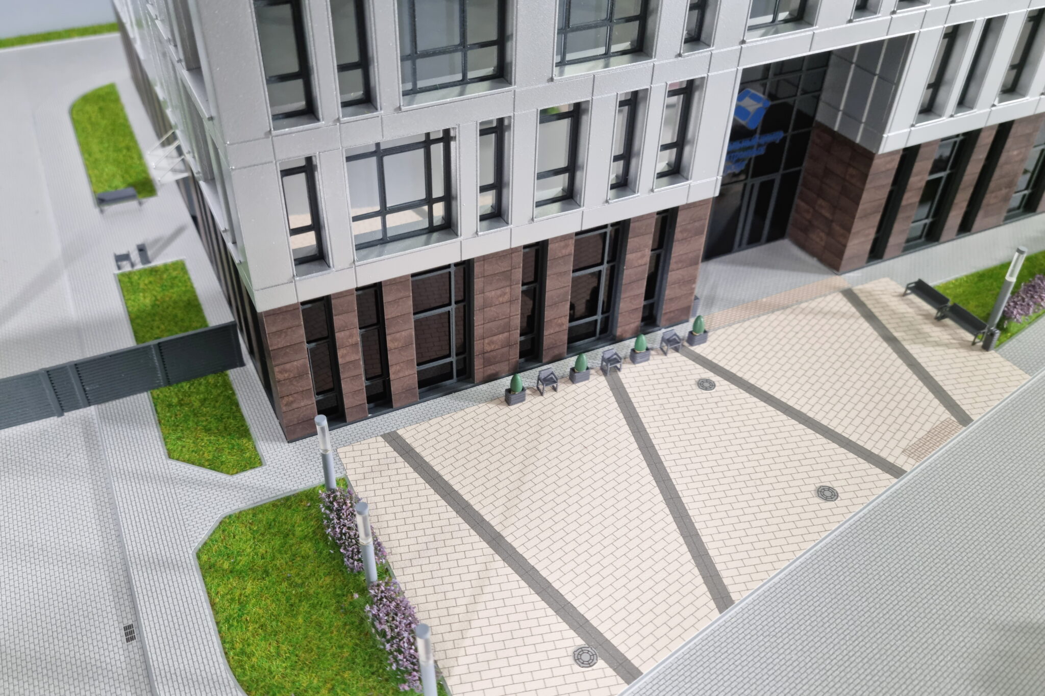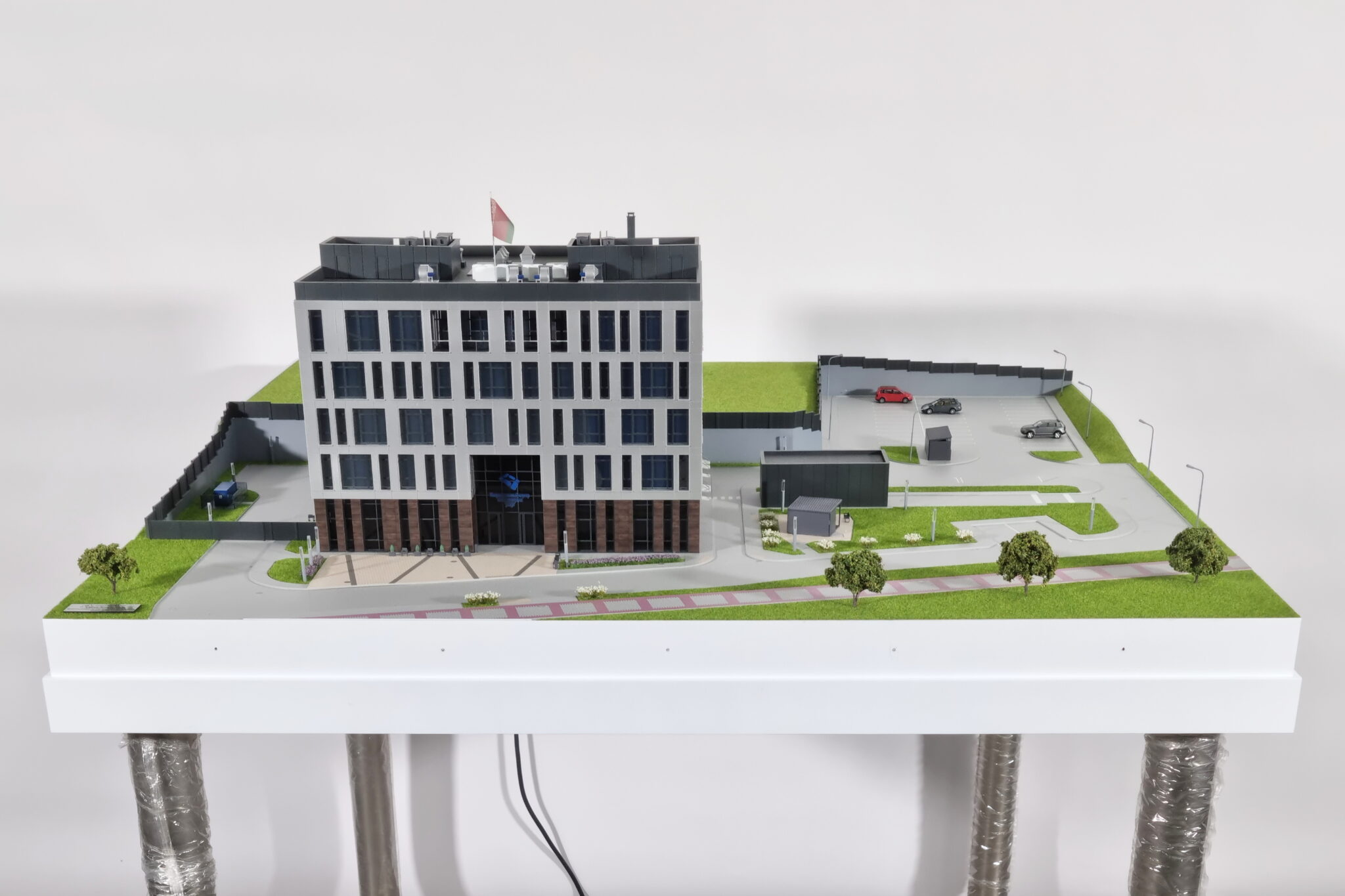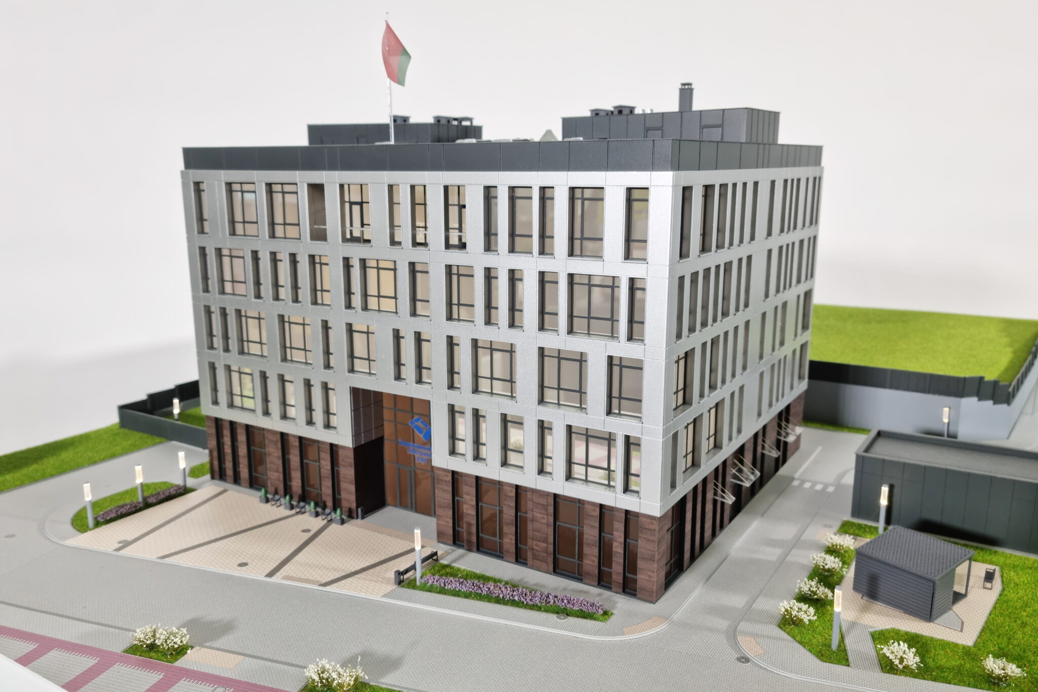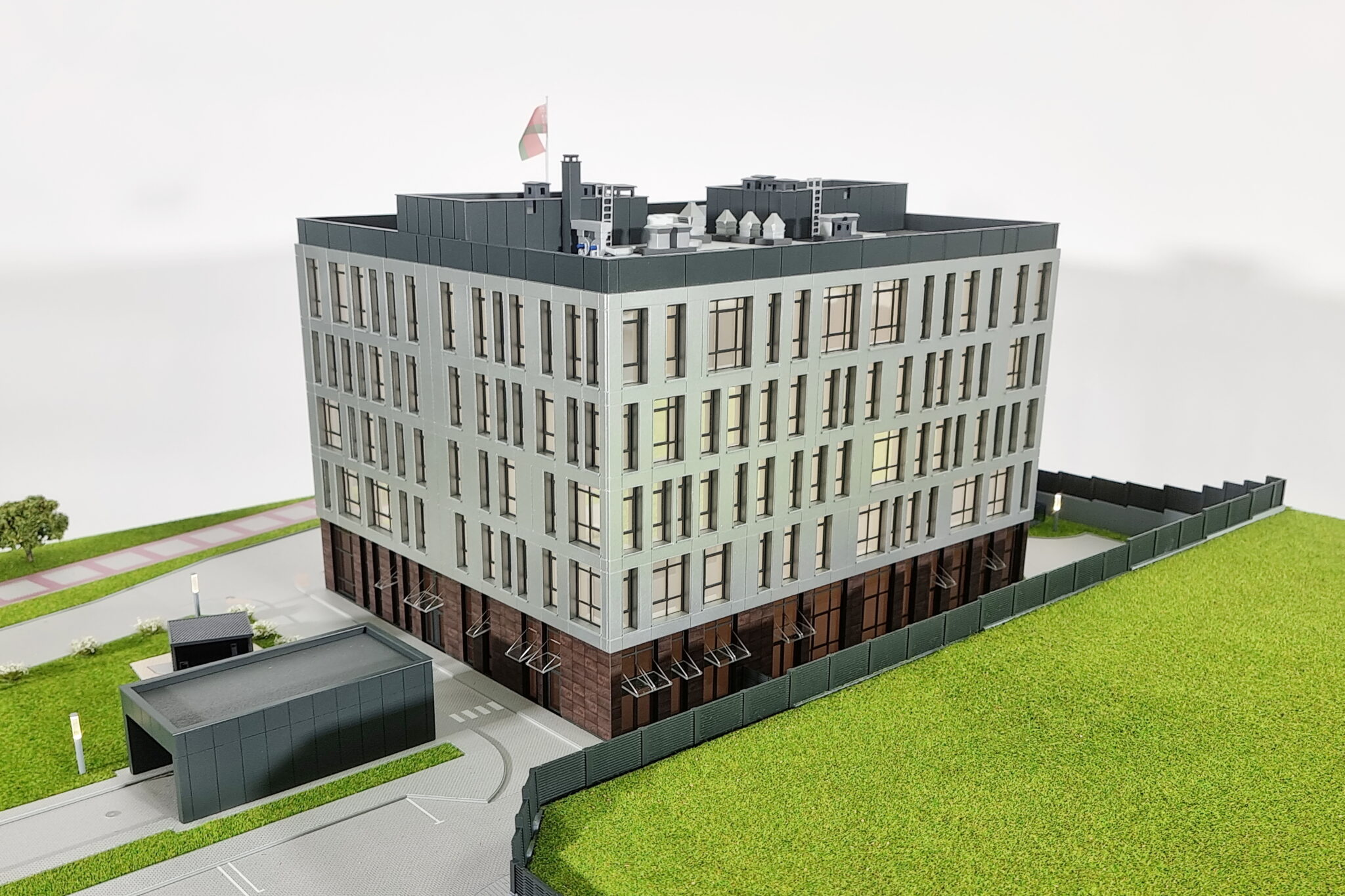 The building is made of plastics of various thicknesses with the application of self-adhesive films and painting of the facades.
