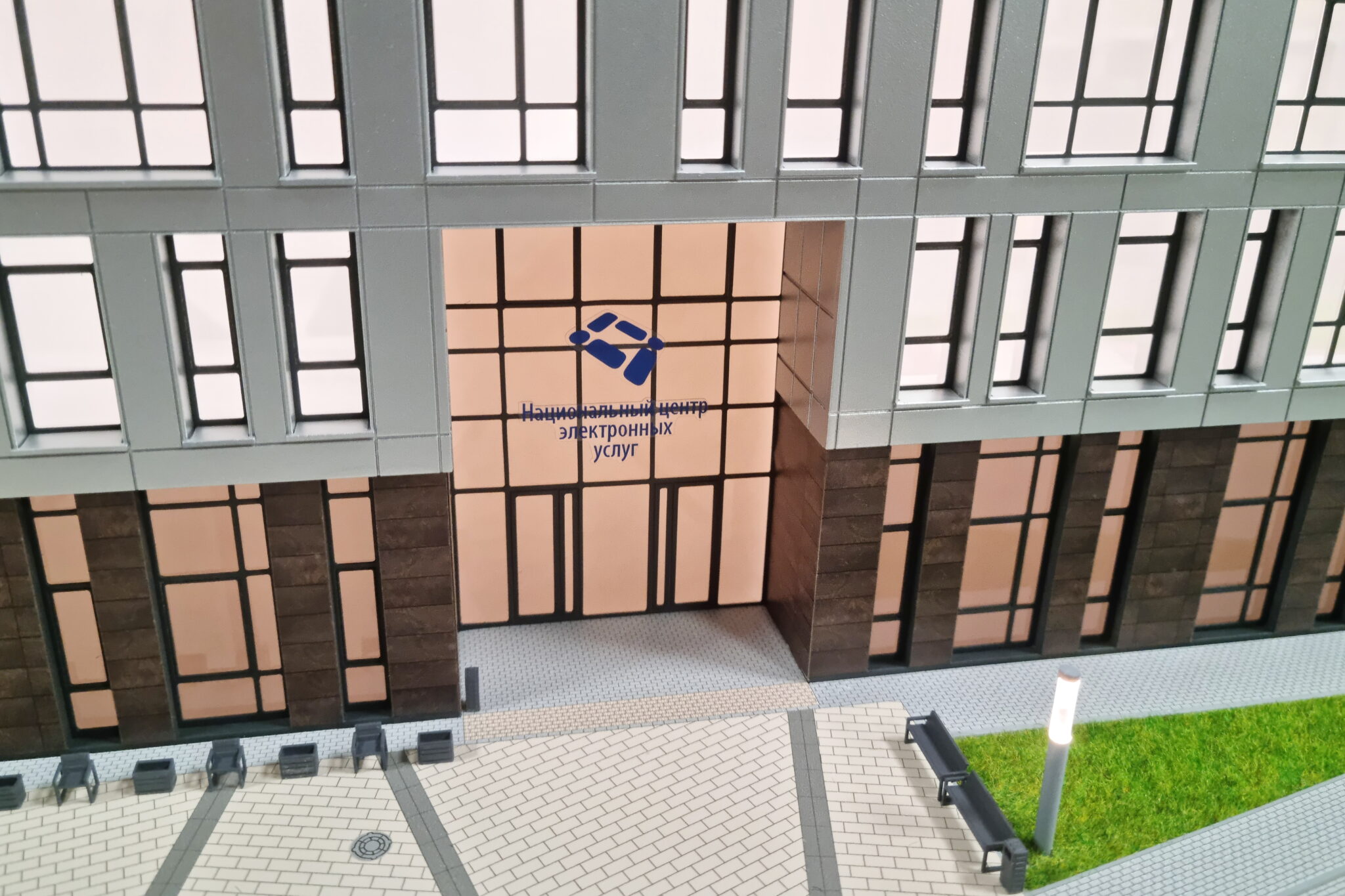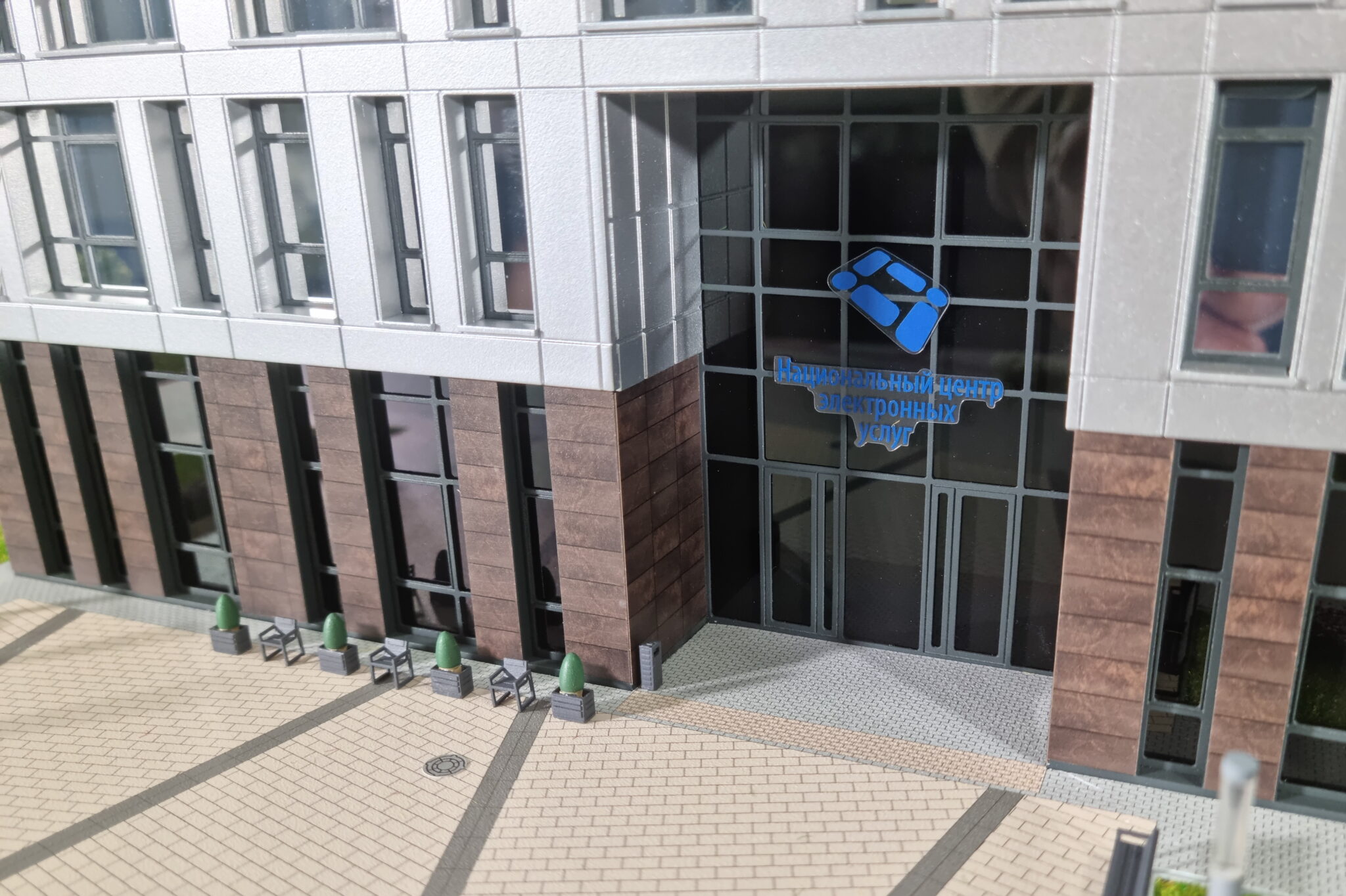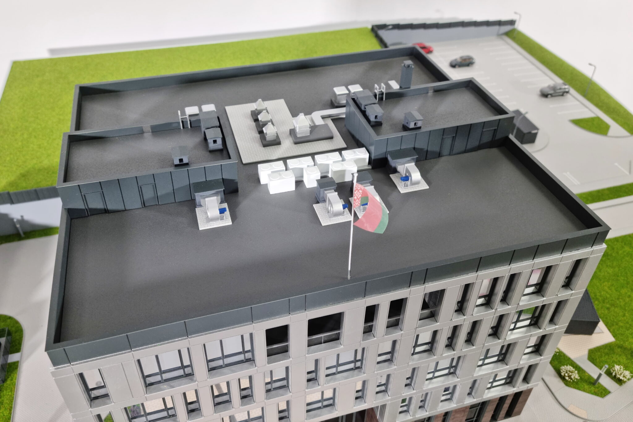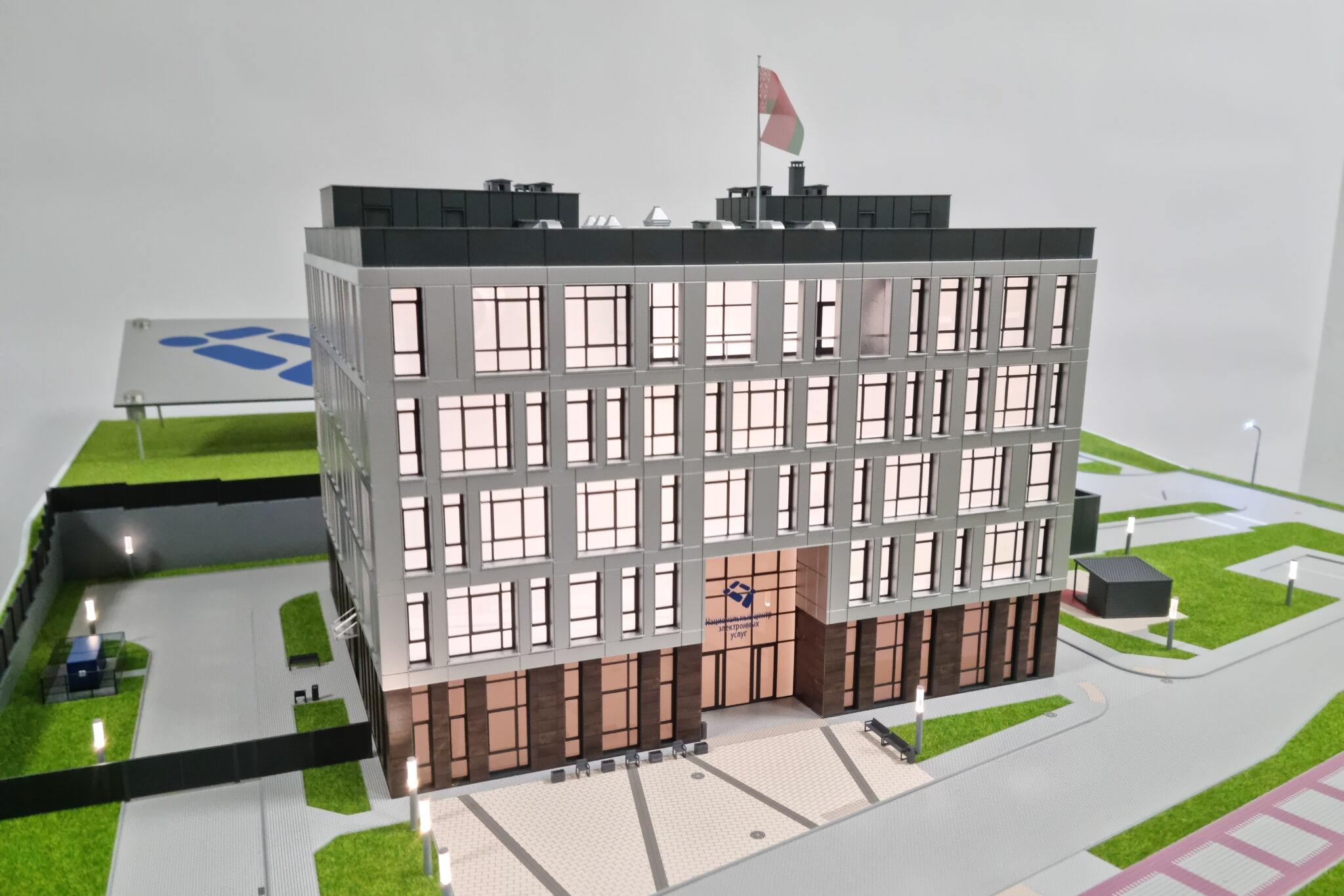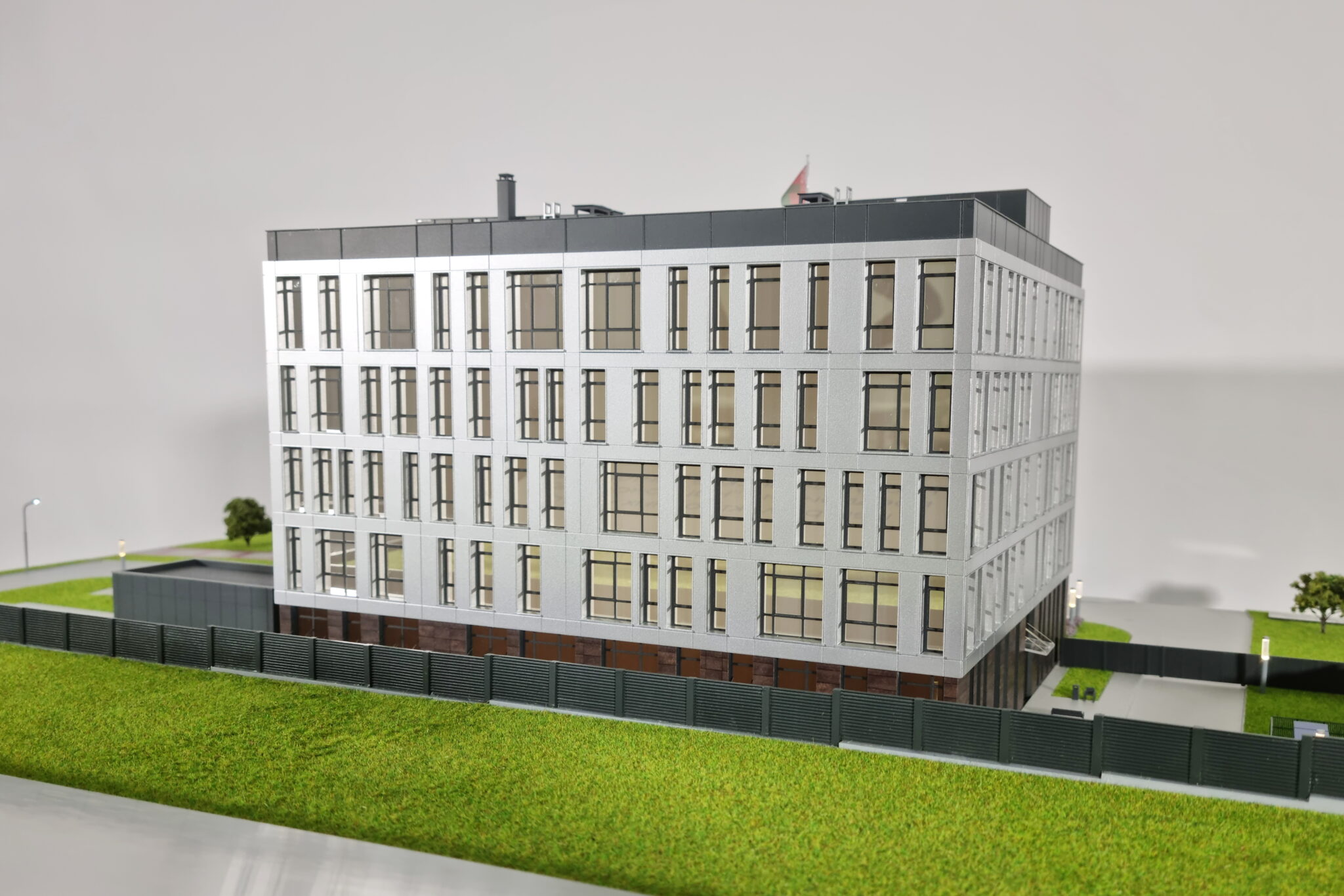 The building is made of plastics of various thicknesses with the application of self-adhesive films and painting of the facades.