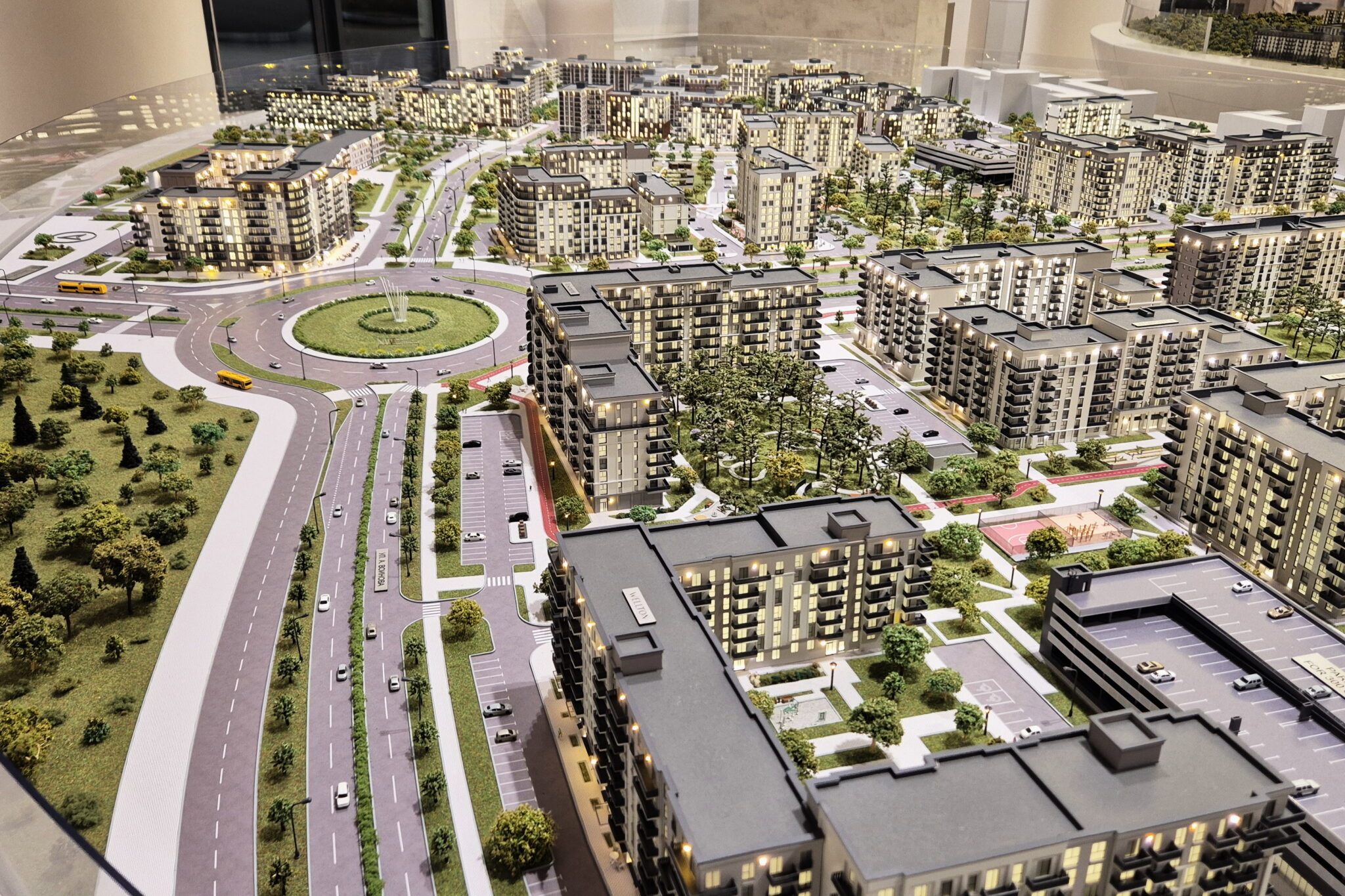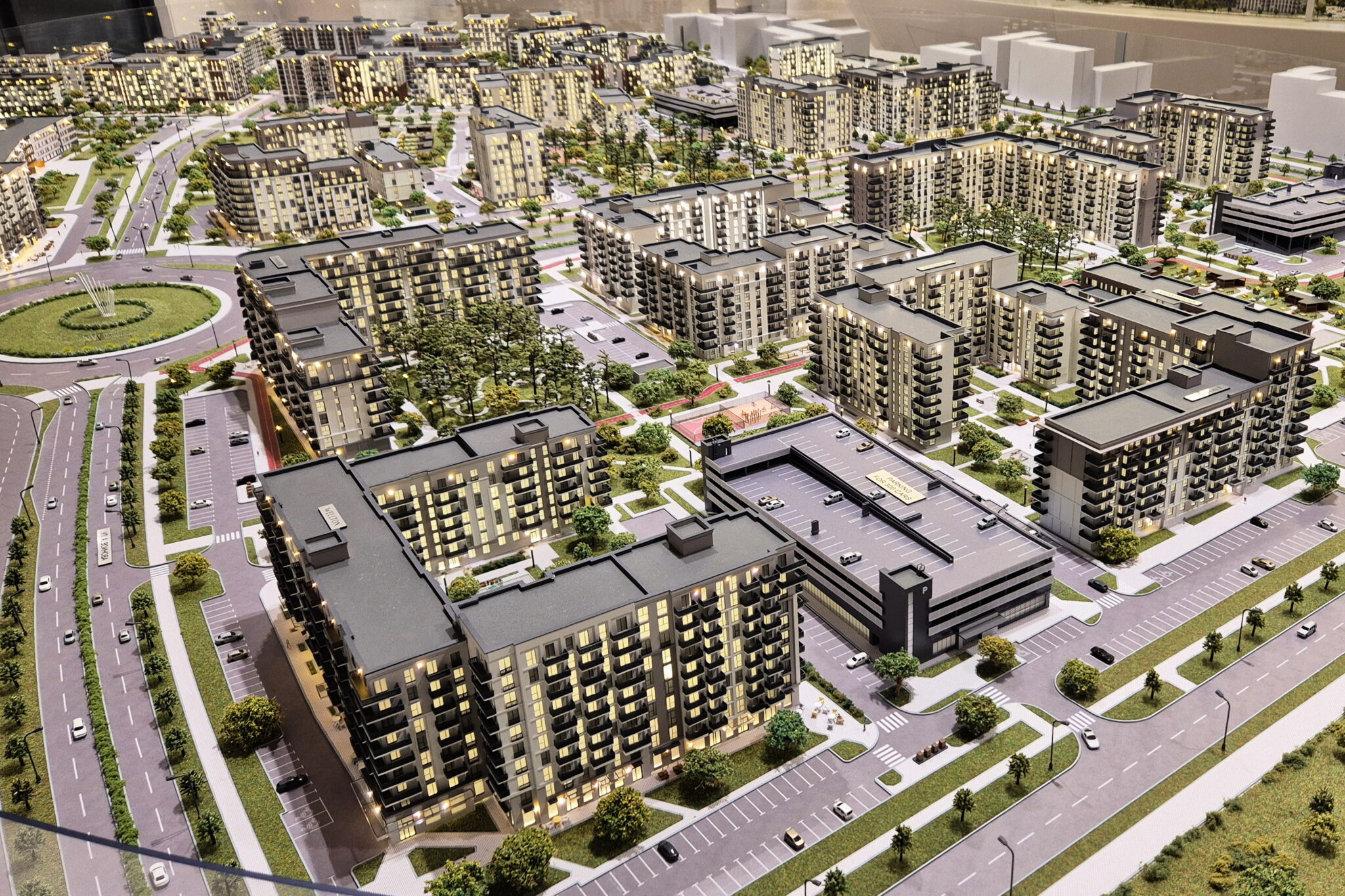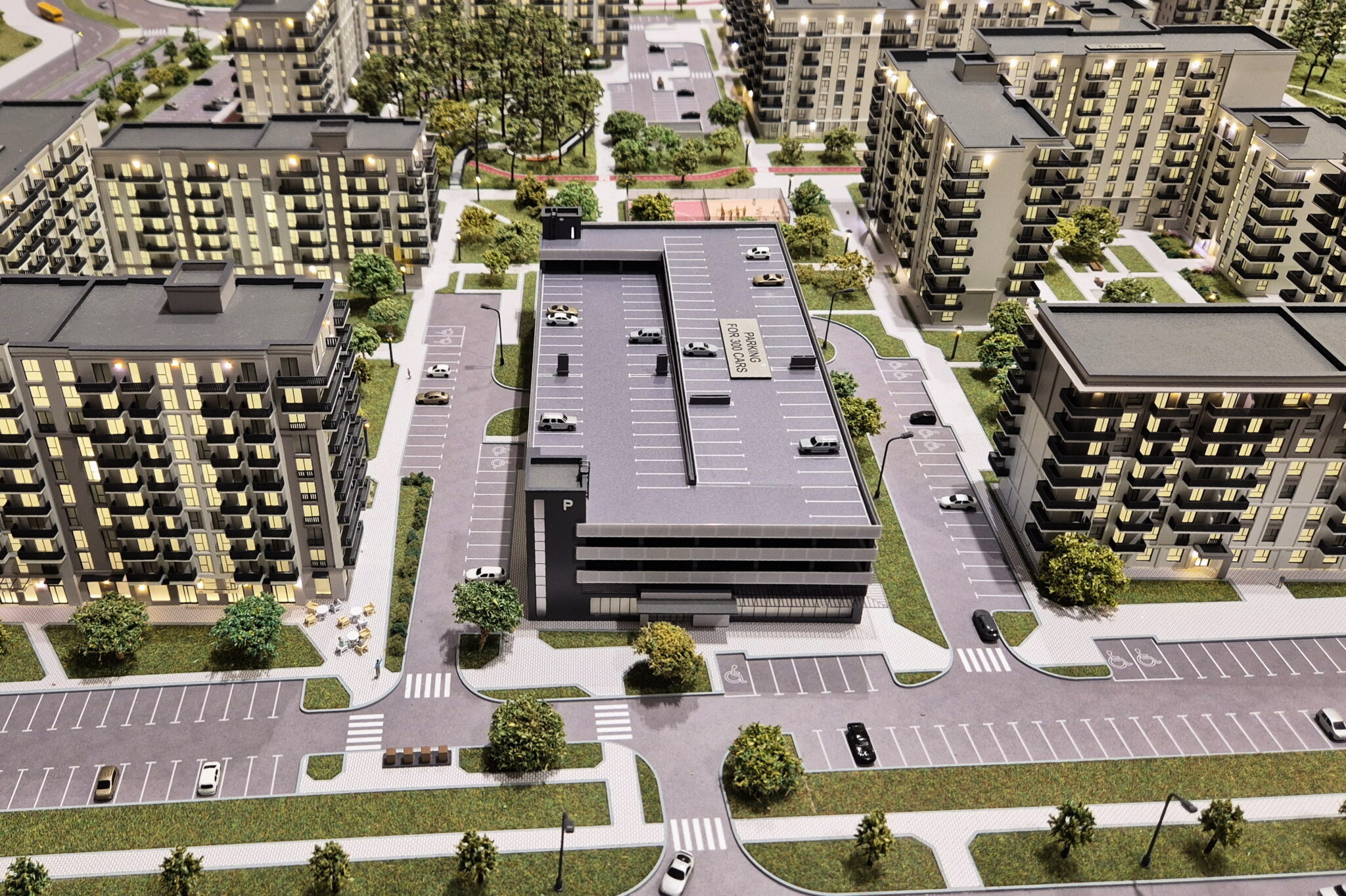 Lighting masts and street lamps are also illuminated throughout the model.