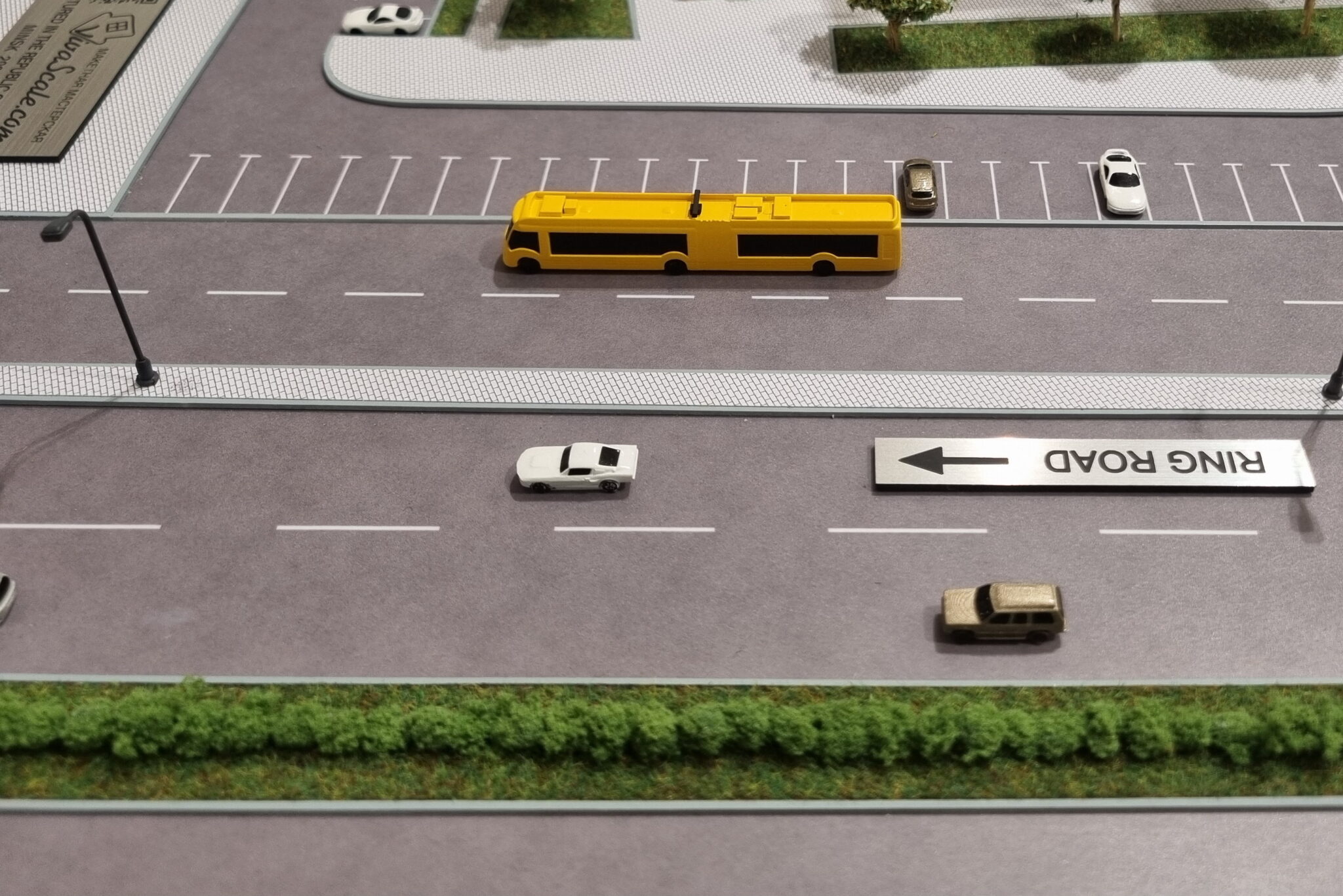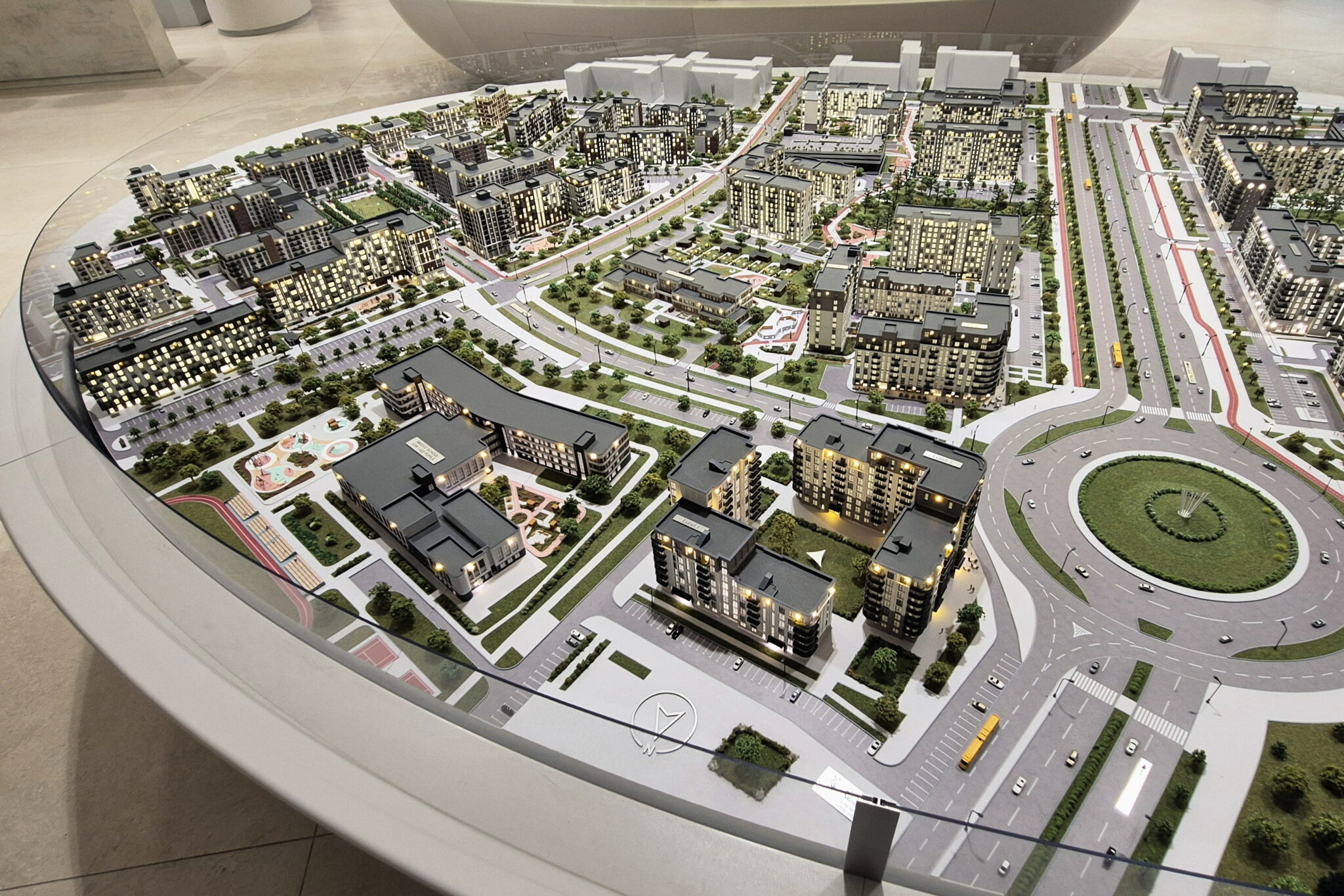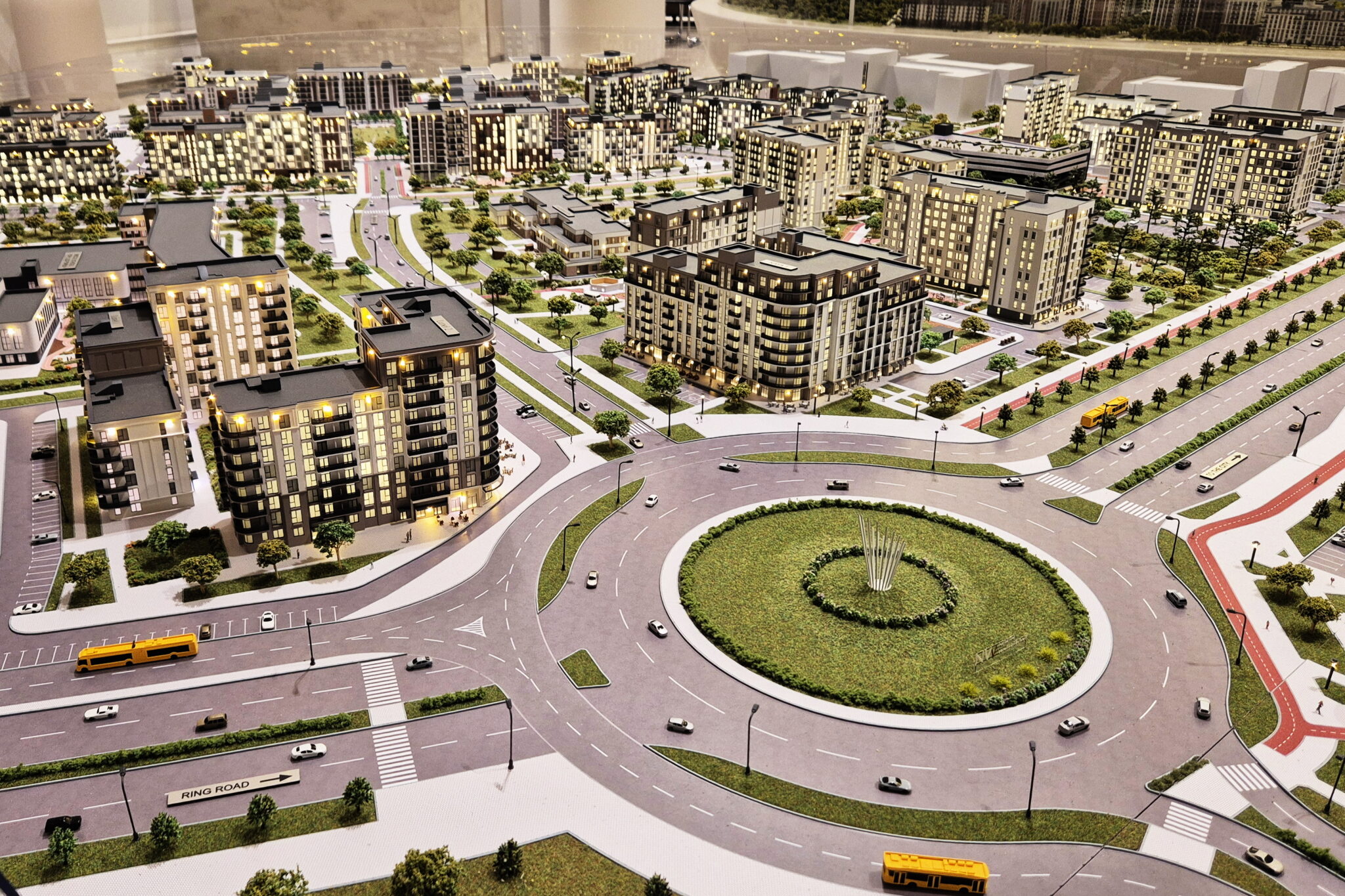 Lighting masts and street lamps are also illuminated throughout the model.