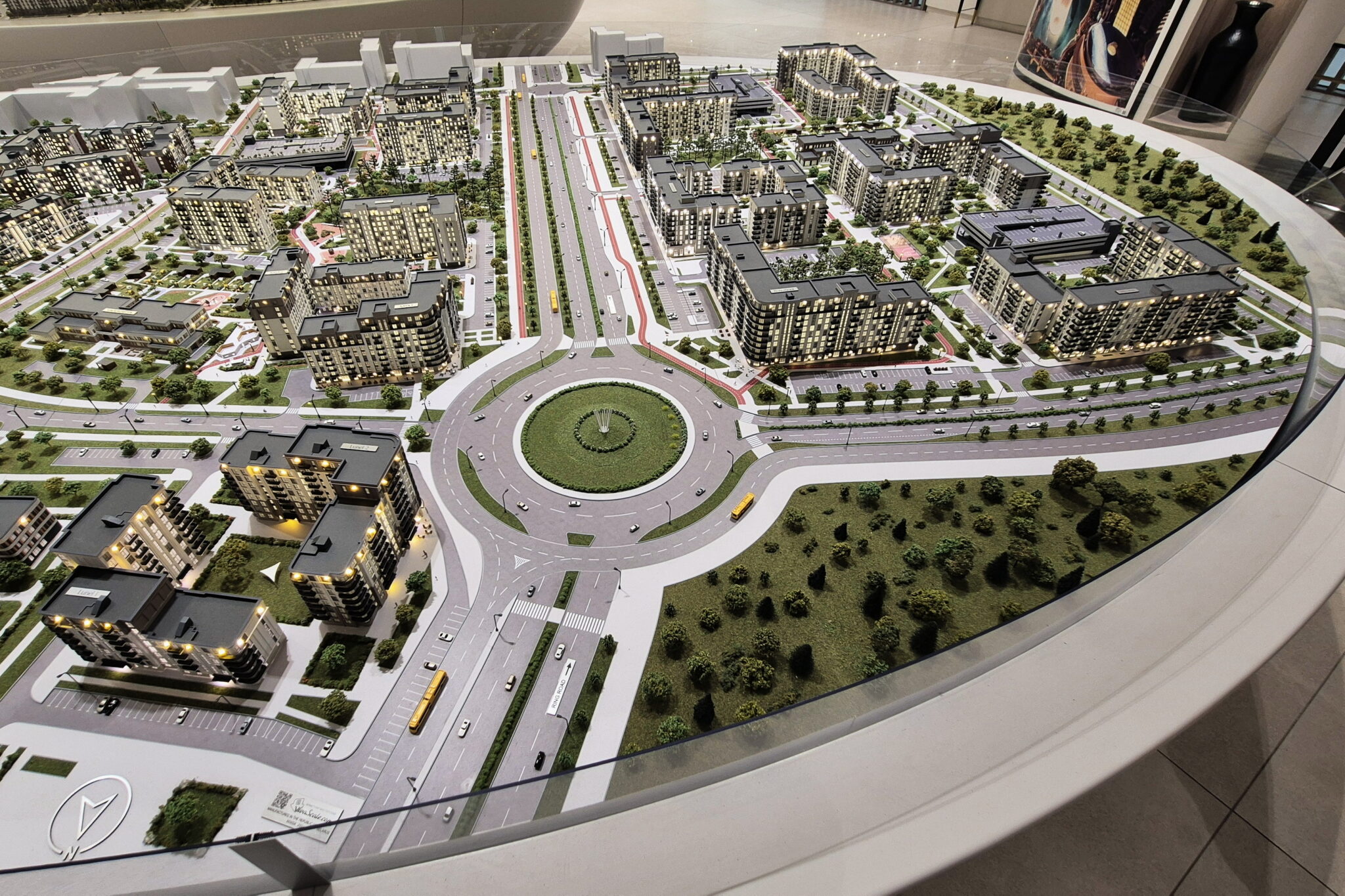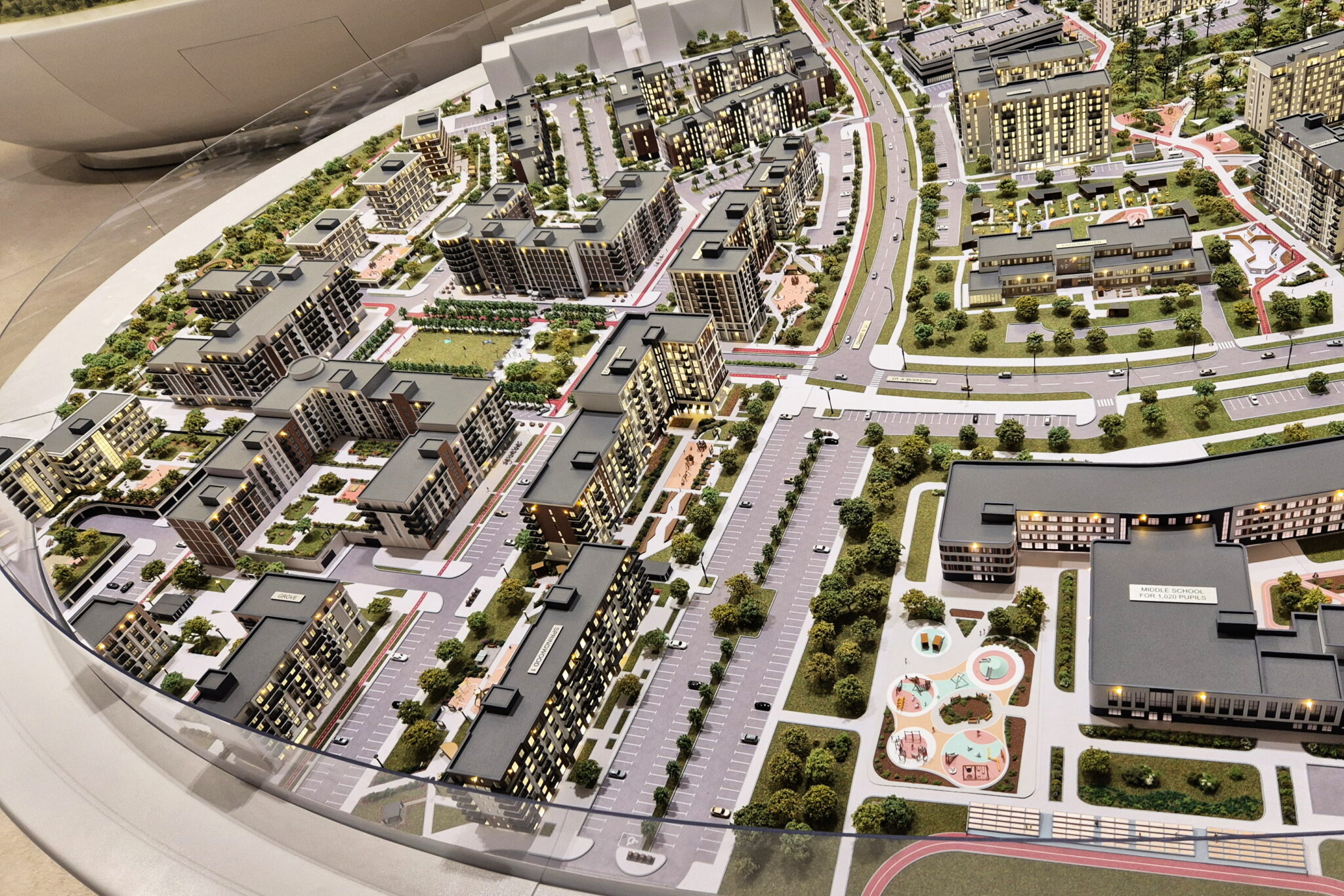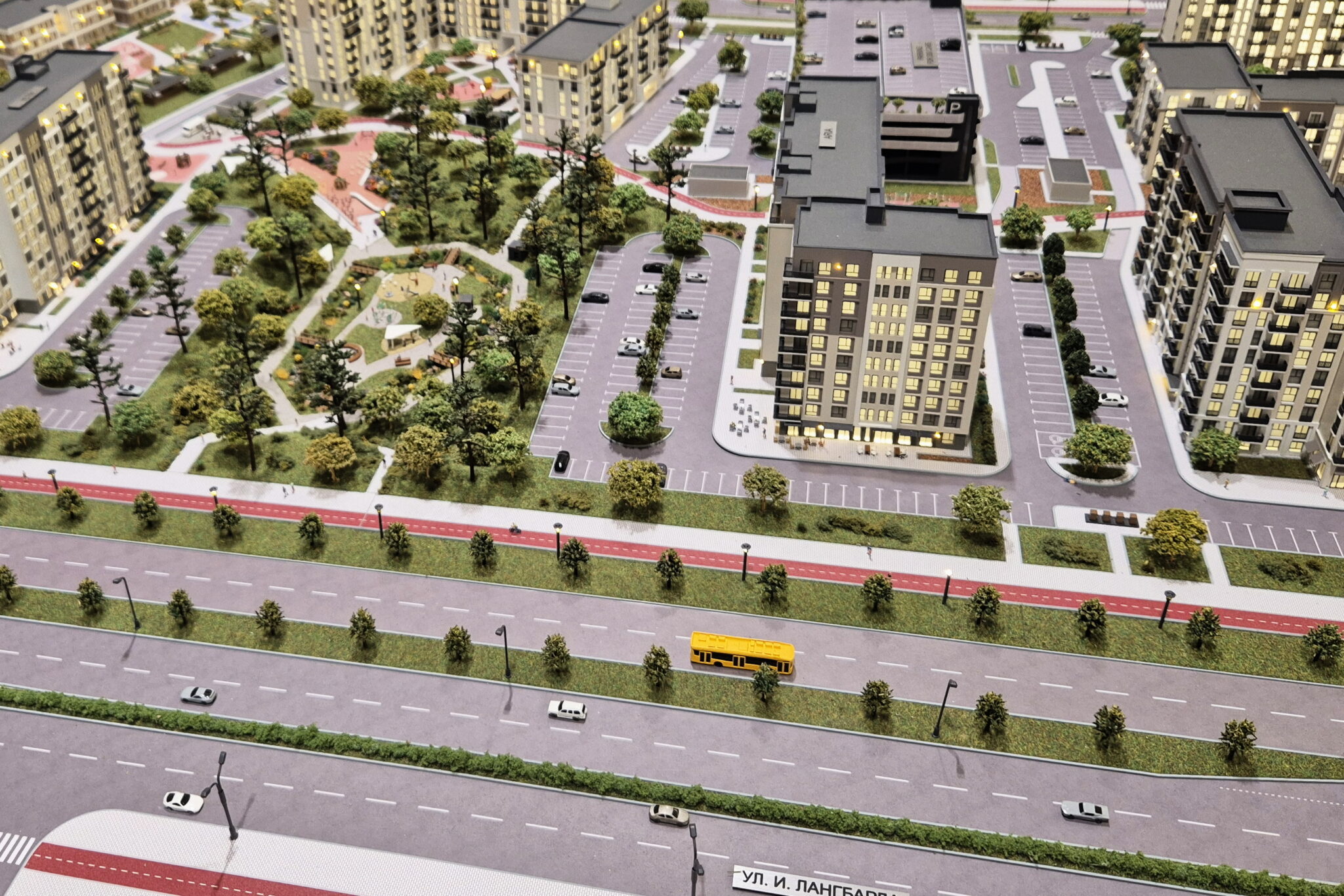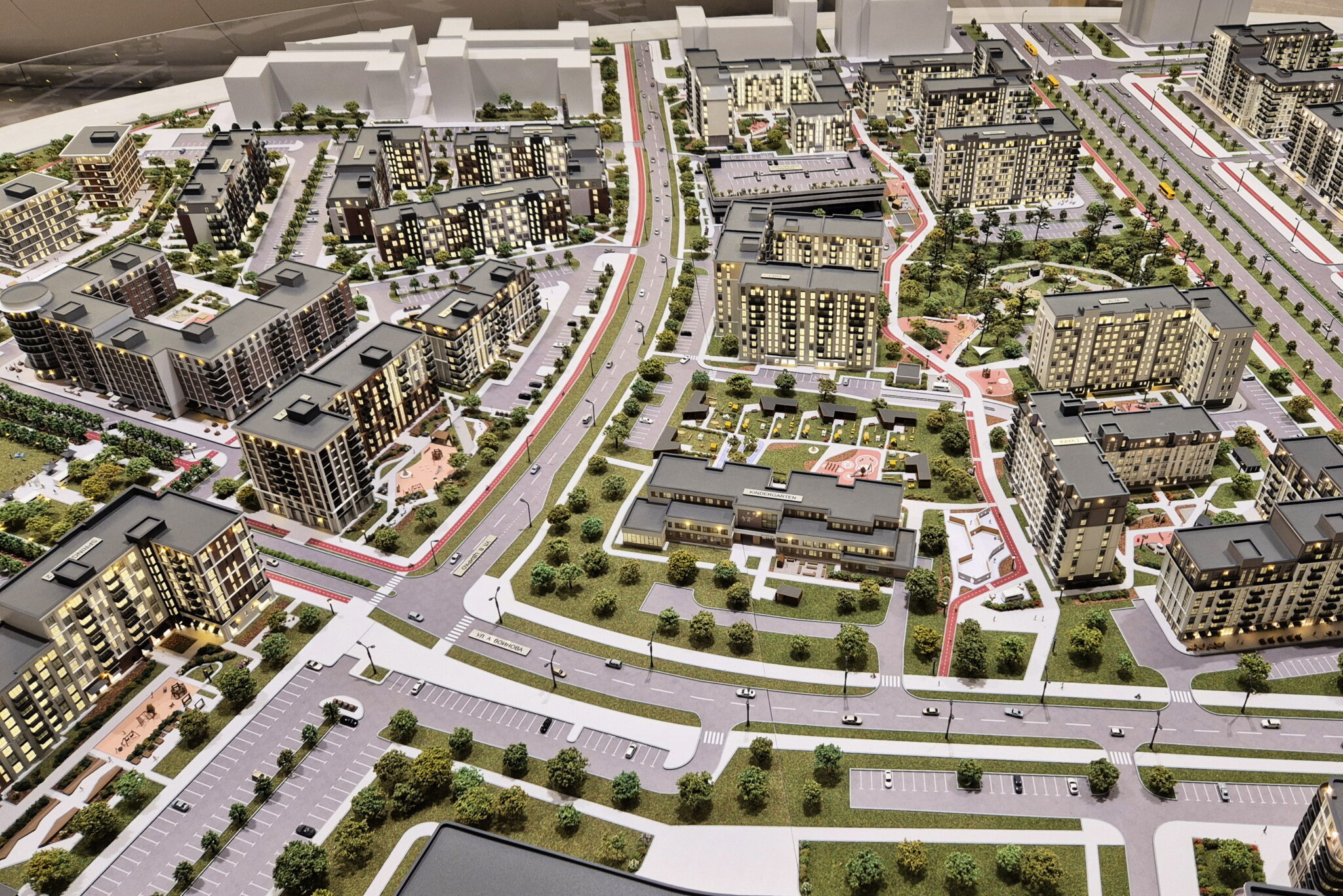 A huge model of the development area of the first, second and third phase of the North Waterfront residential complex in Minsk.-