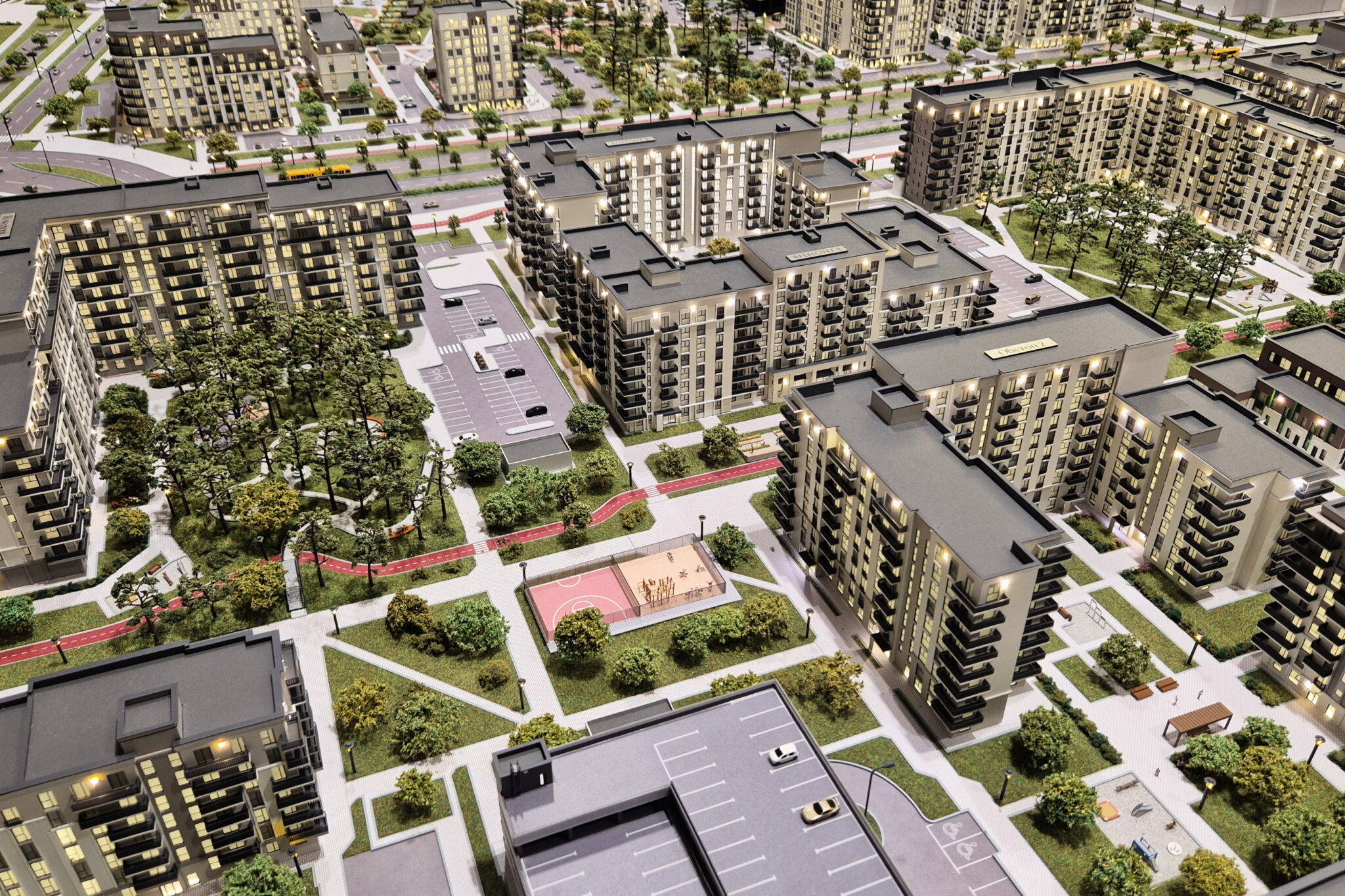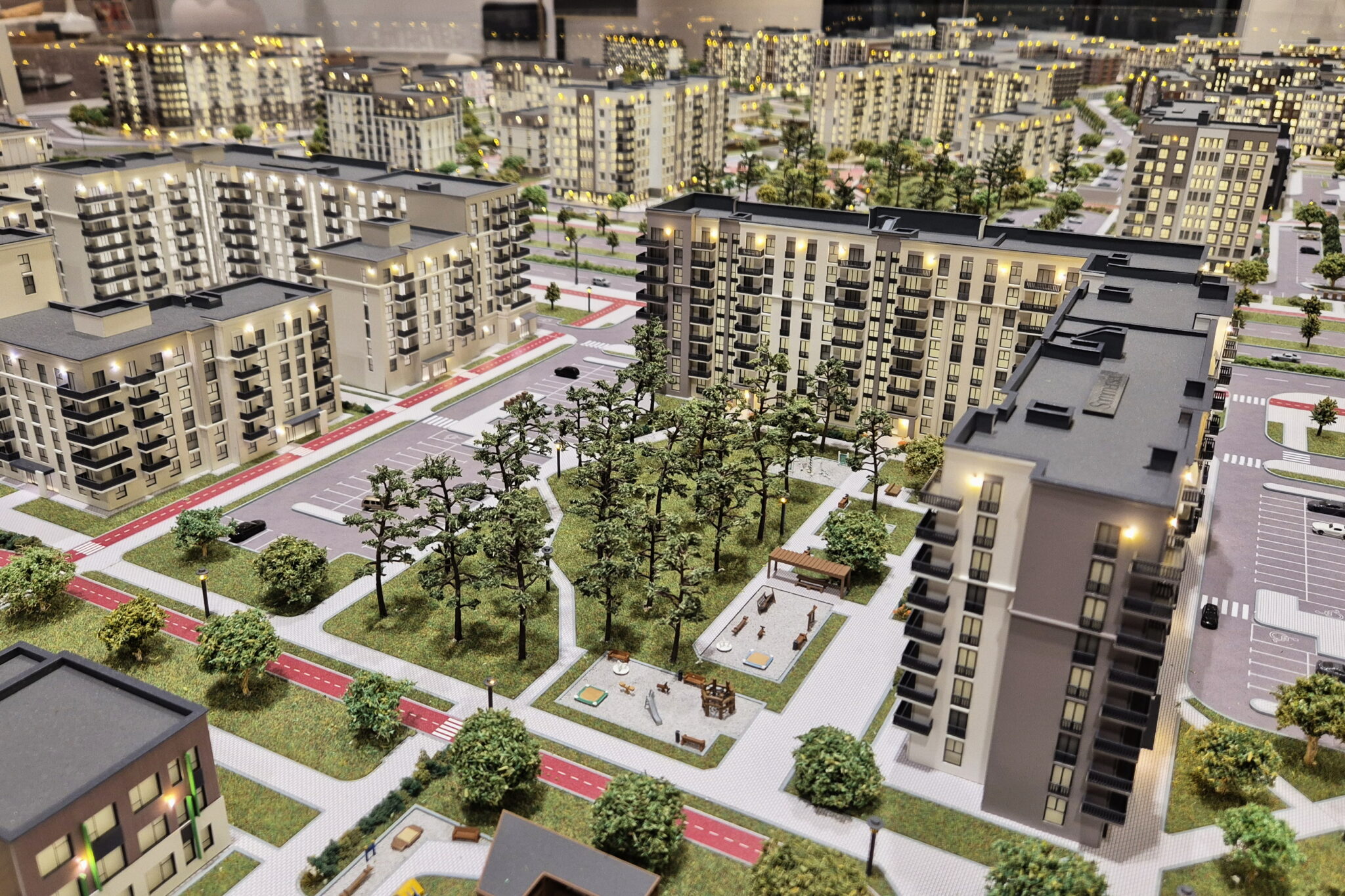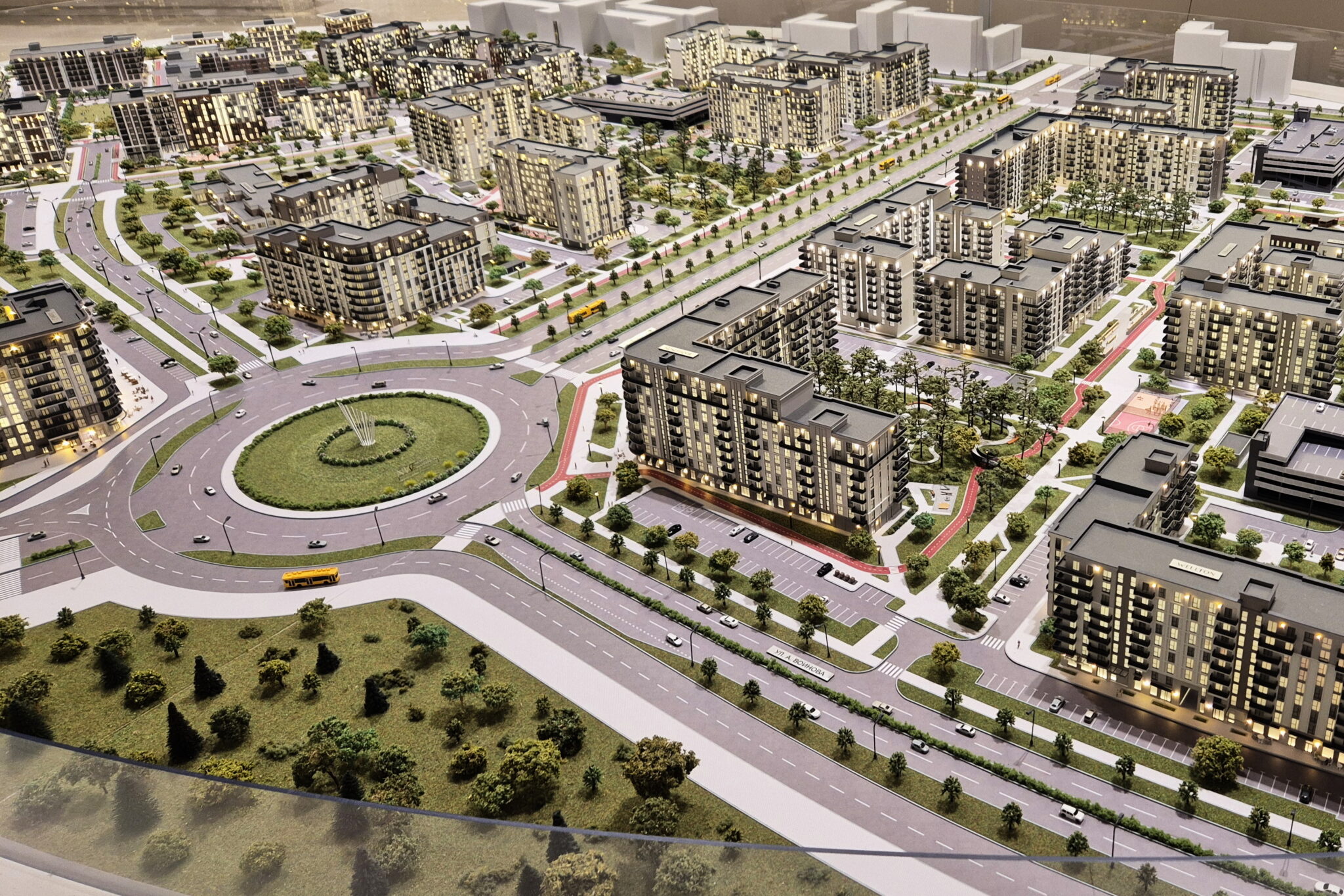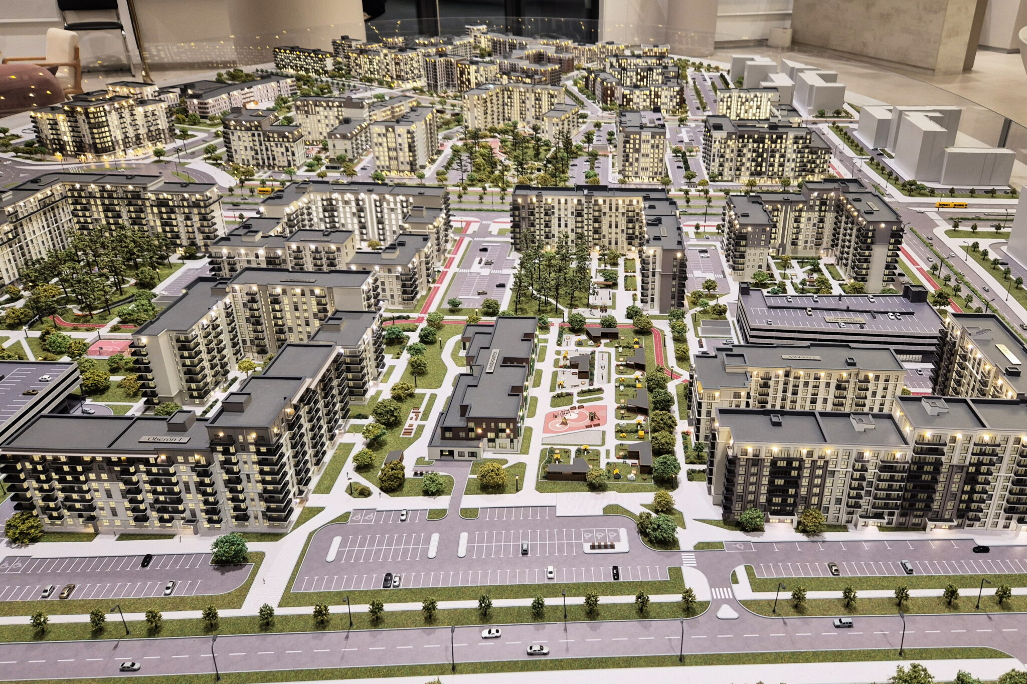 A huge model of the development area of the first, second and third phase of the North Waterfront residential complex in Minsk.-