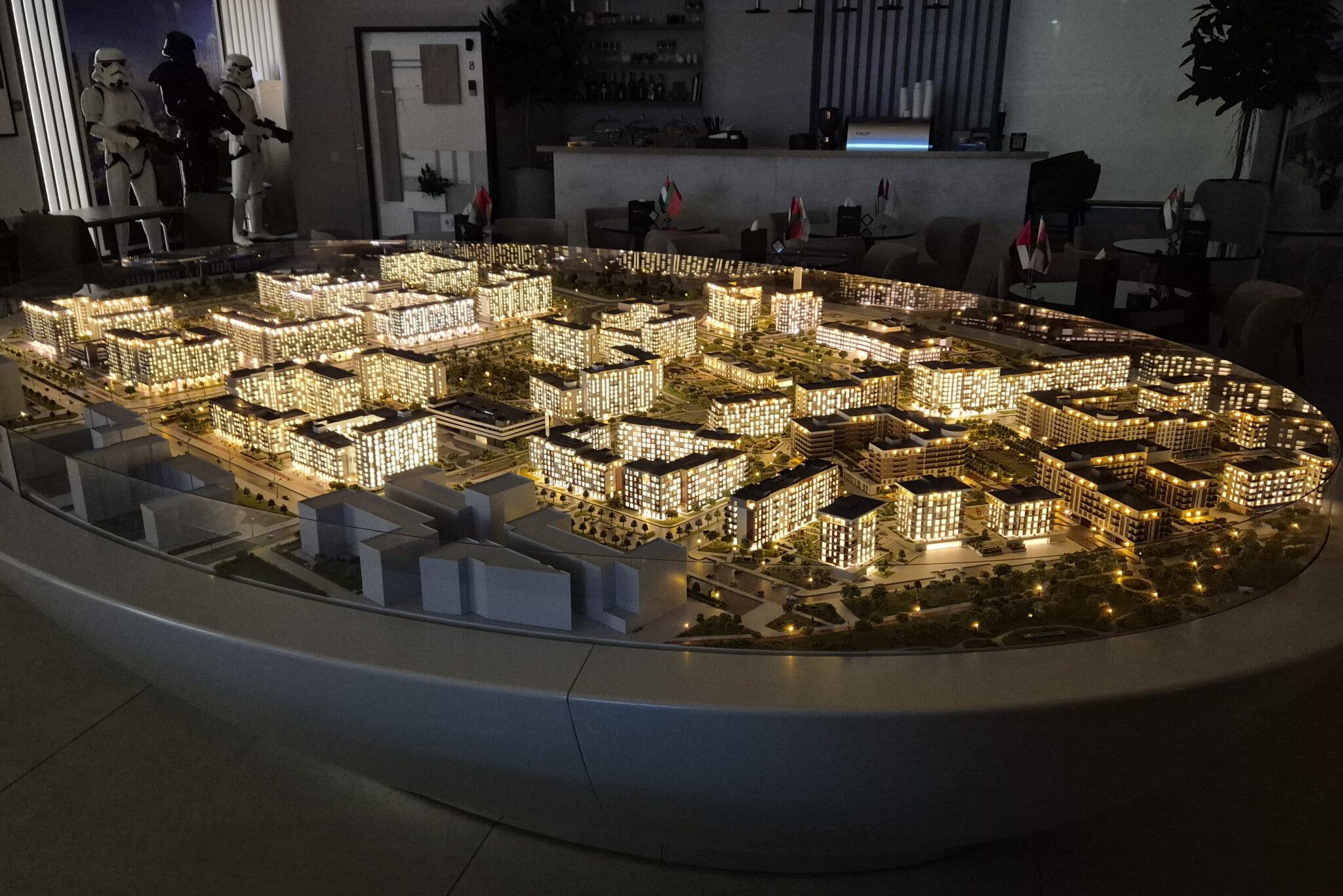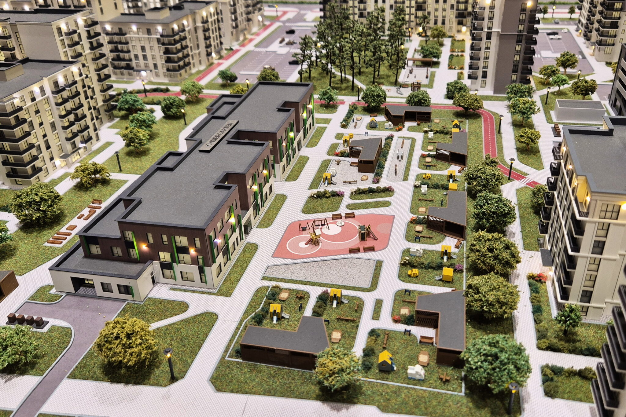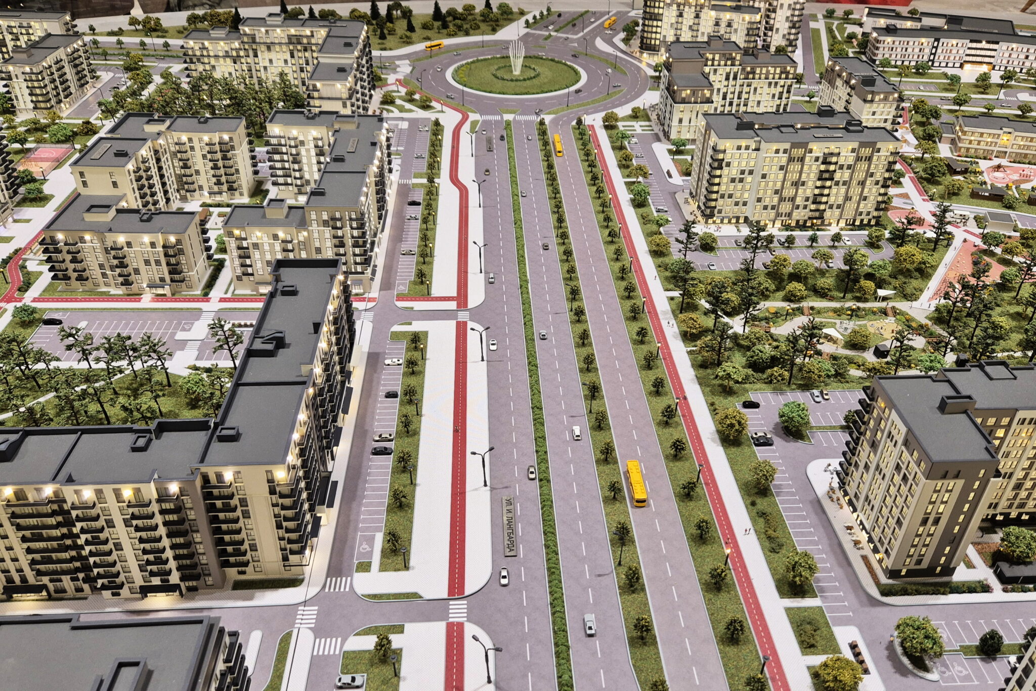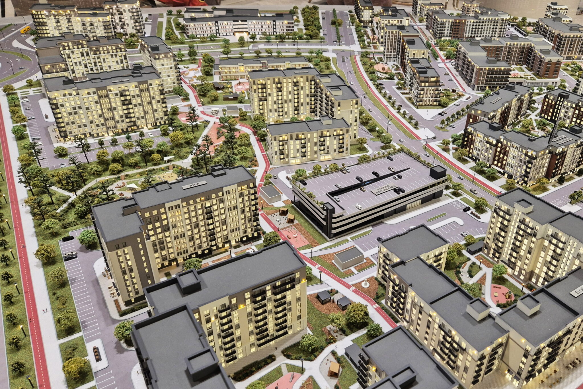 A huge model of the development area of the first, second and third phase of the North Waterfront residential complex in Minsk.-