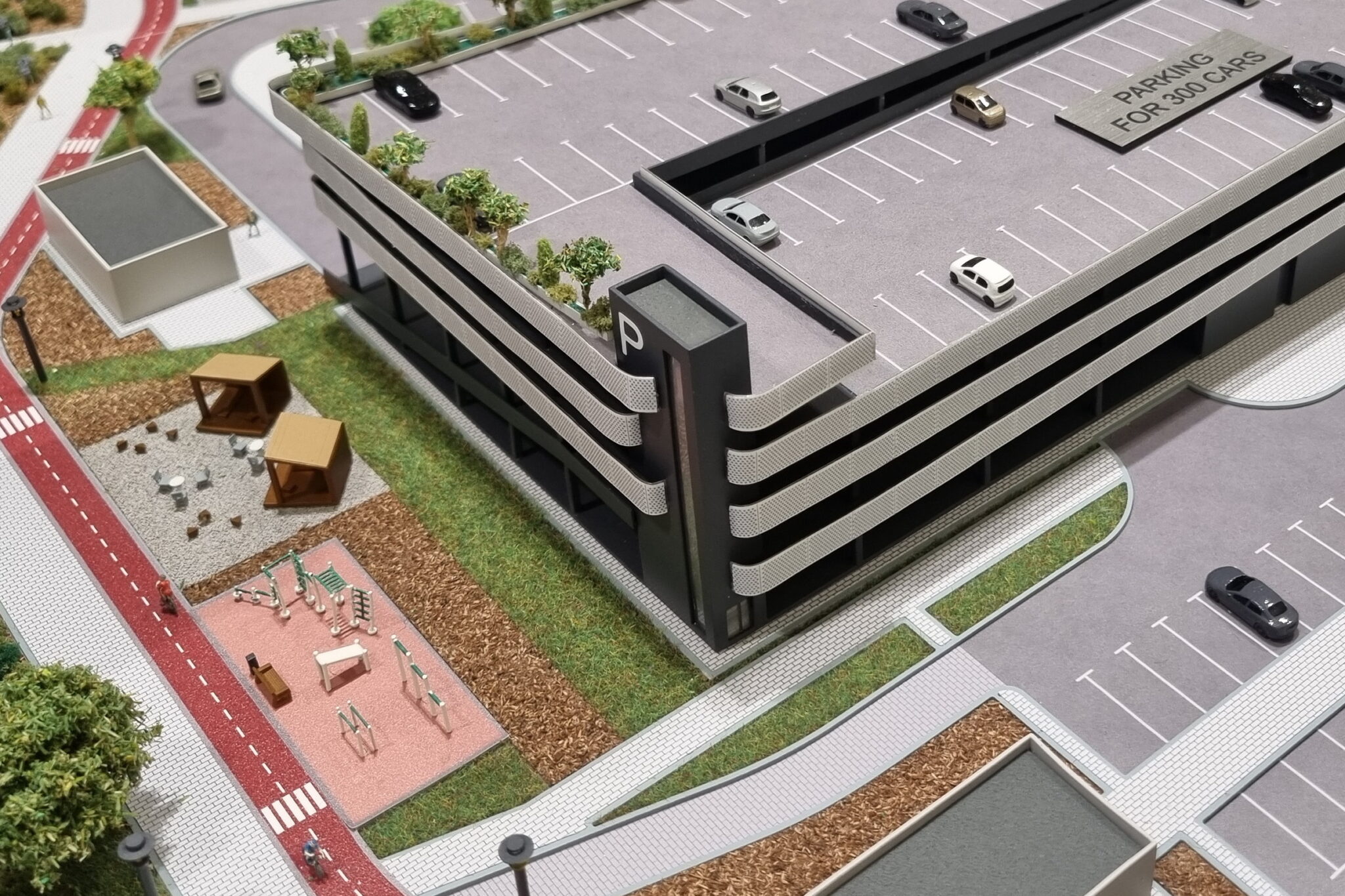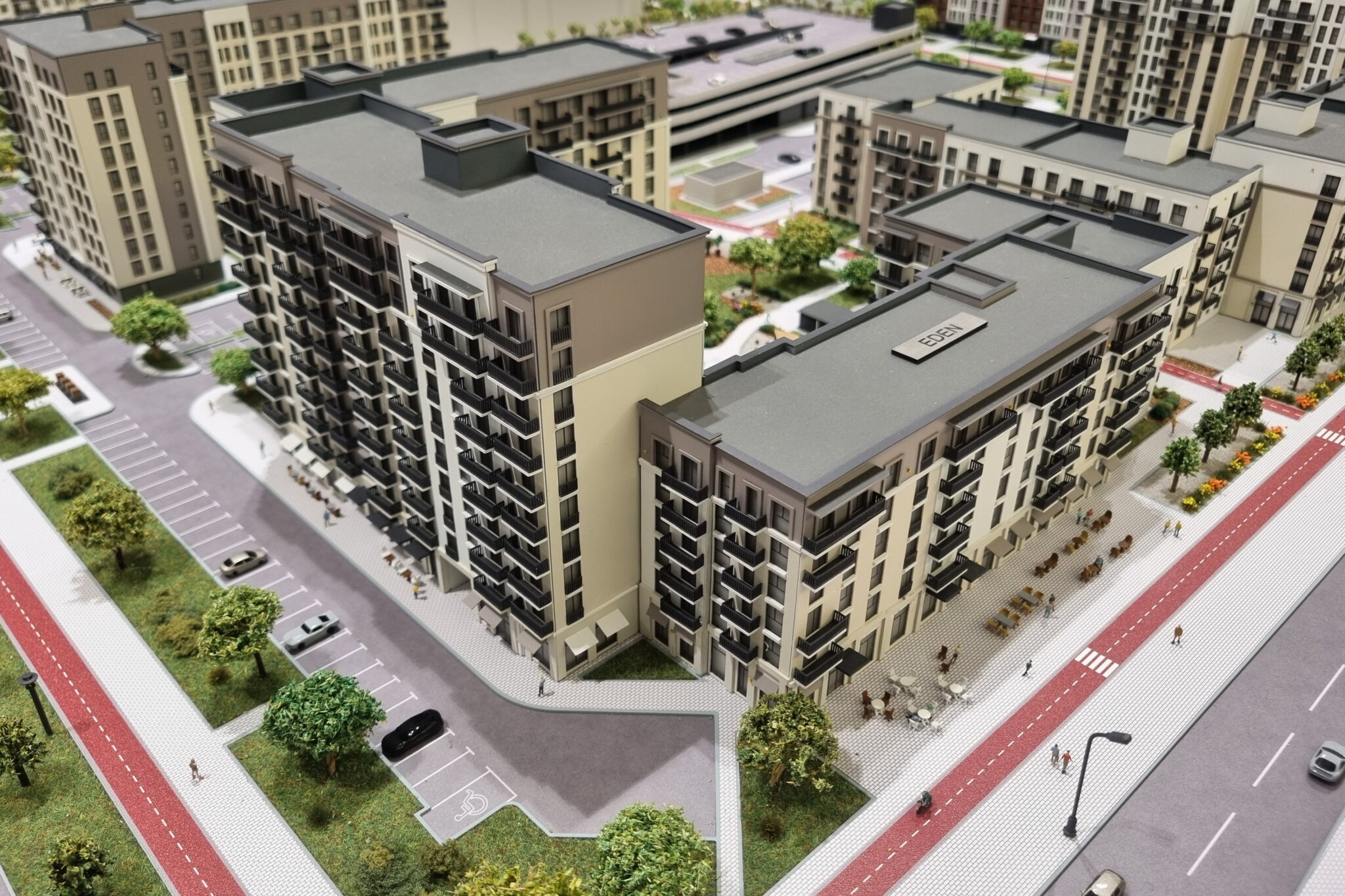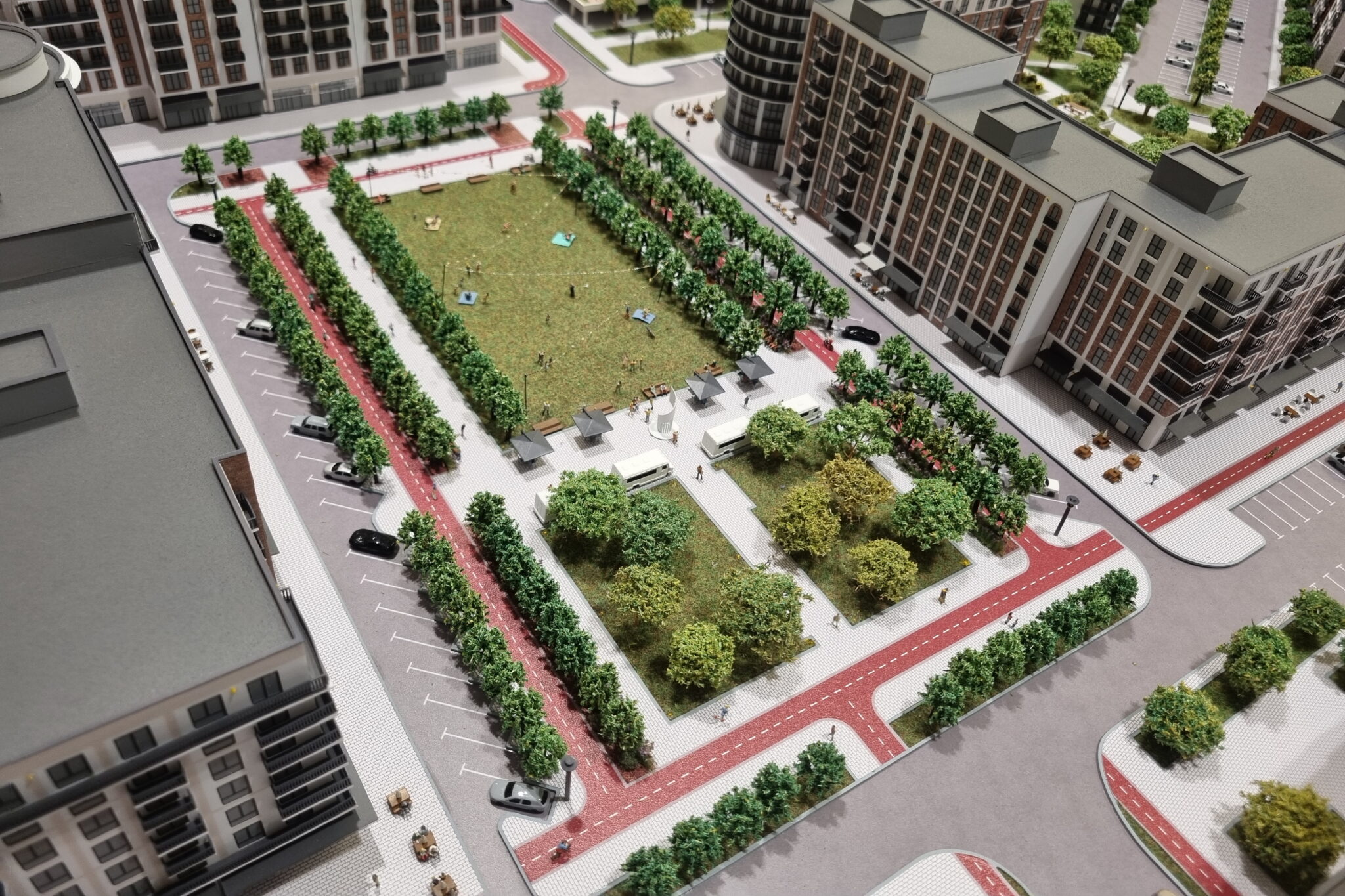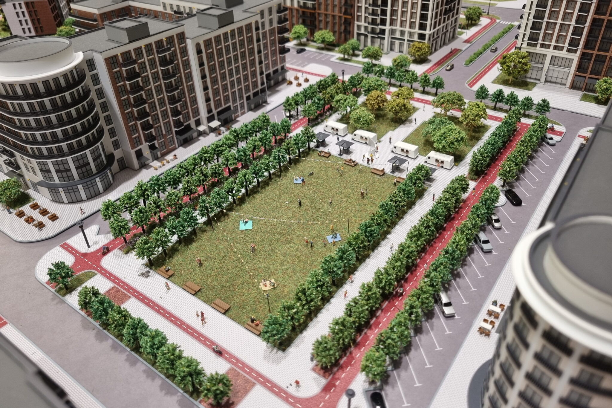 Many realistic figures of people are installed in the courtyard area, in the retail area and park area.